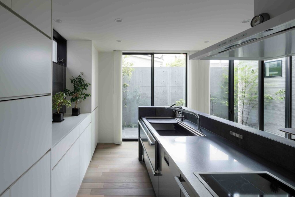 道路や隣家からの視線が届きやすい条件でしたが、RCの壁で目隠しをしながら庇を2階の高さまで上げていただいたことで、開放的な空間になりました。リビングやキッチンから庭を感じながら、昼間でもカーテンを開けたまま過ごしたいという想いも形になり、昼も夜も外を気にせず暮らせています。