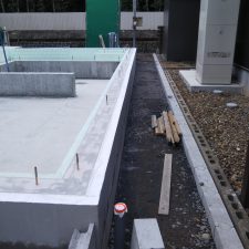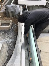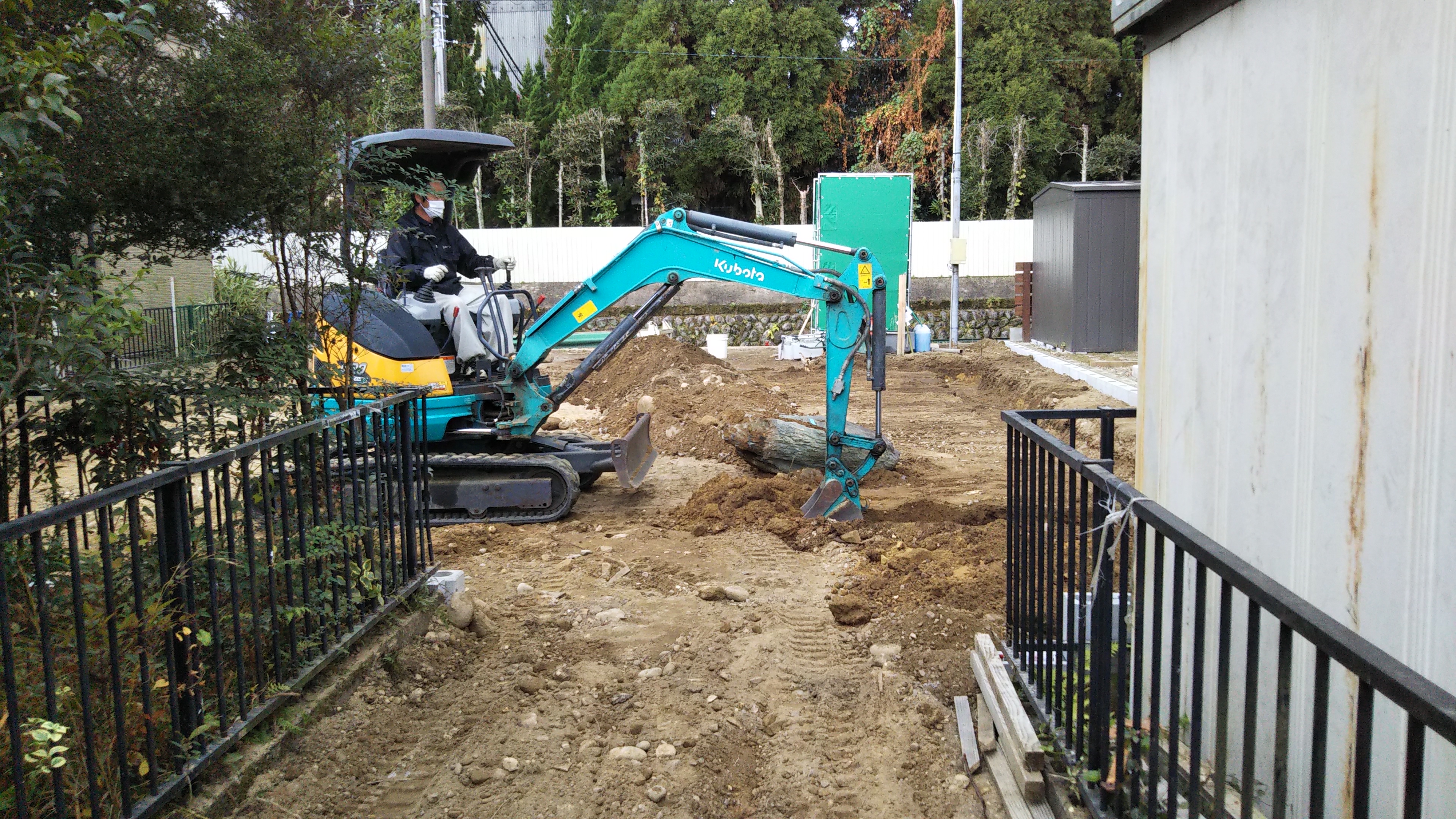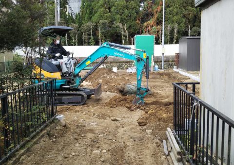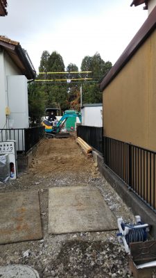 地盤調査の結果、改良の必要無しとの判定が出ましたので工事が始まりました。敷地に余裕がありませんので基礎工事の前に隣地との境界のブロック積から工事をしていきます。