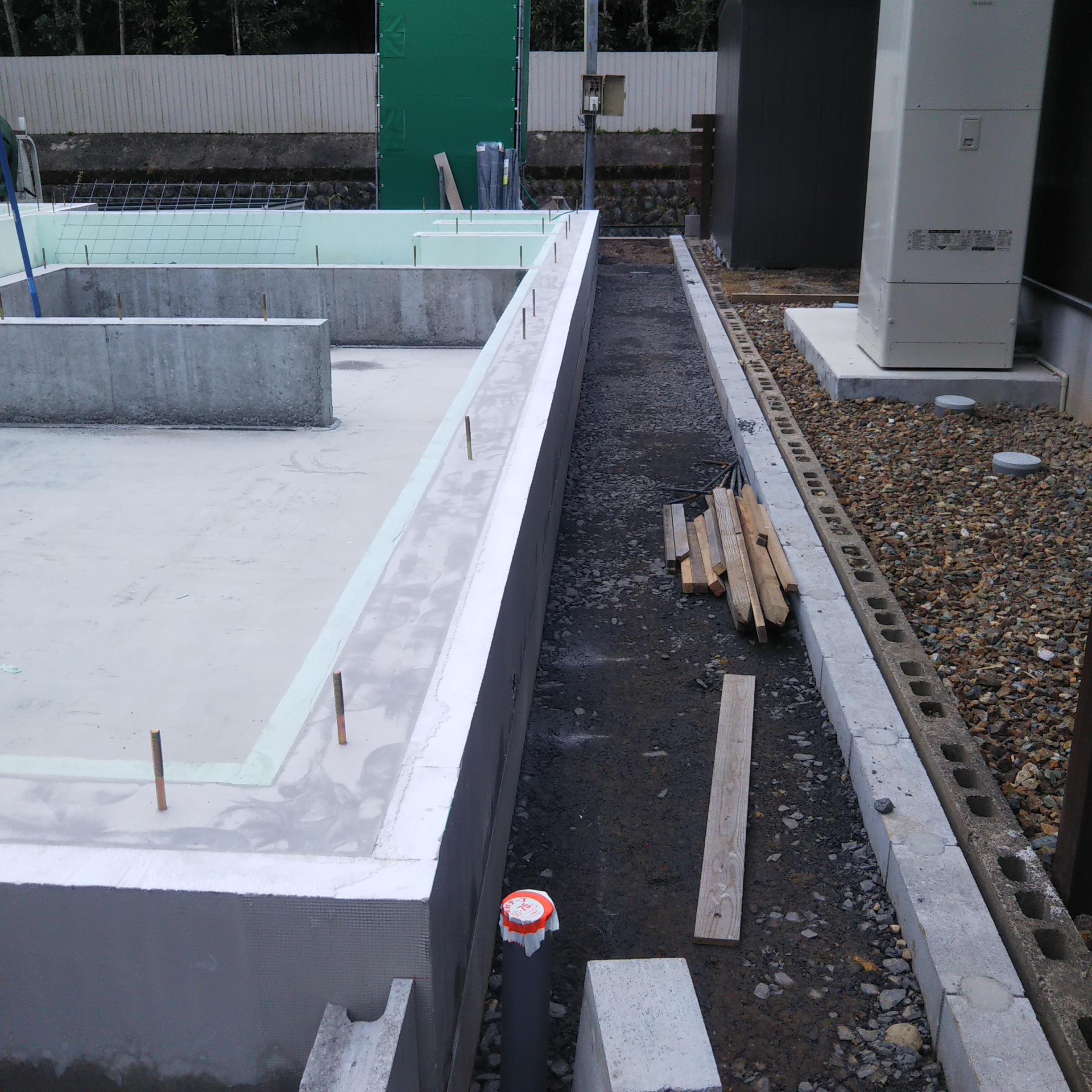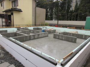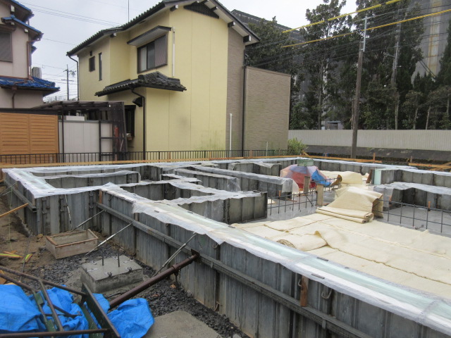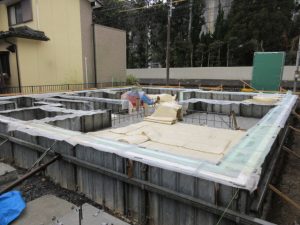 ベースコンクリートの打設完了です。立ち上がりのコンクリートはまだ打設されていませんが、枠の上には凍害を防ぐための養生シートが準備されました。