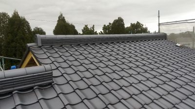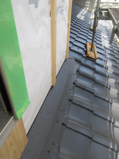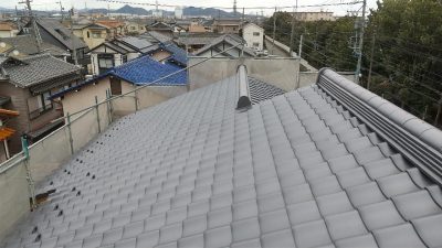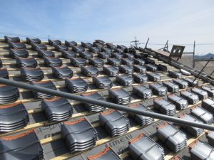 この日は瓦屋さんも来ています。昇降機で重い瓦を上げていきます。道路幅が狭いため屋根の上が写せななかったのですが、瓦屋さんがしっかり残してくれていました。