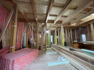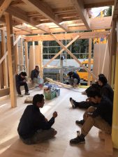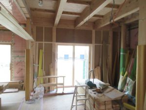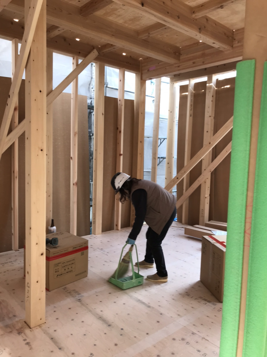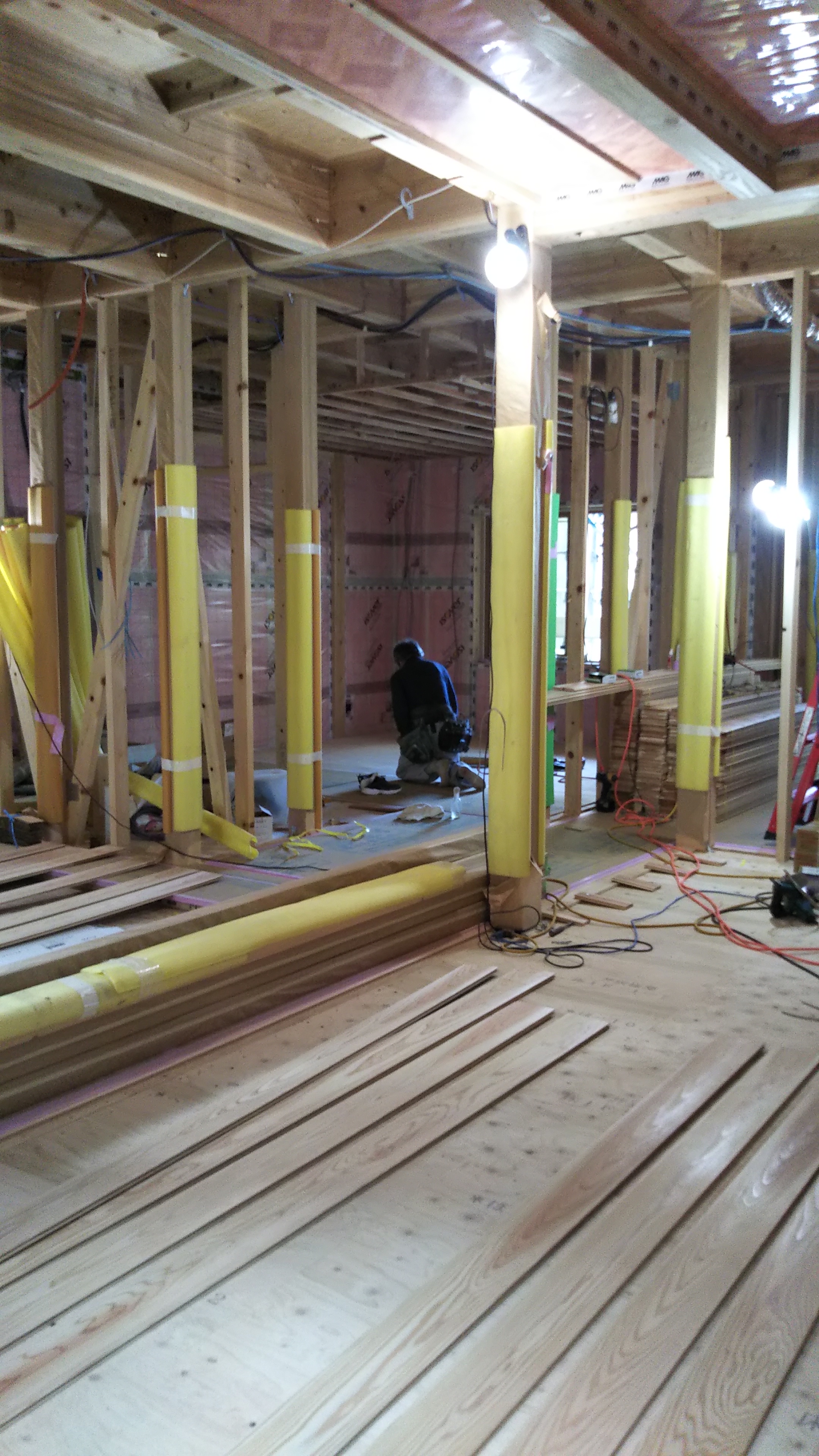 2階ではs戸大工さんが指示をしながら下げ振りで建付けを確認中、営業のk藤さんは2階の床の施工が終わって安全な場所をお掃除しています。