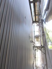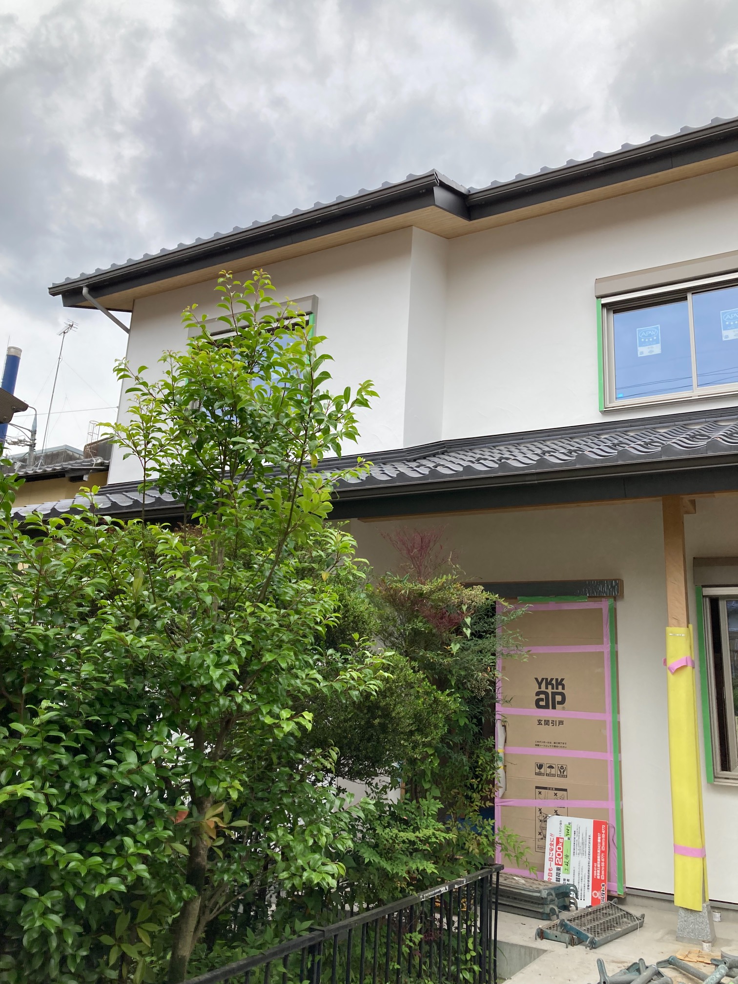 外部はシルバー系のガルバリウム鋼鈑が張られました。漆喰待ちの玄関側は化粧柱があるので、傷がつかないように大事に養生されています。