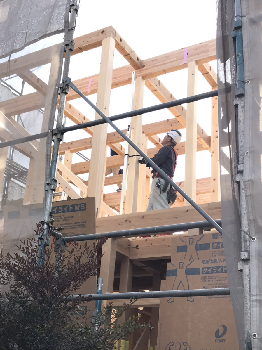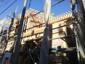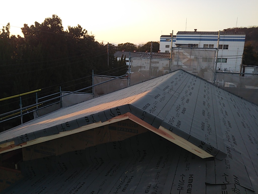 2日目で2階屋根作業が終わり、3日目で残り下屋のルーフィングを敷き、およそ2日半で上棟を終えました。