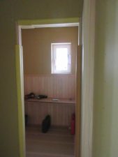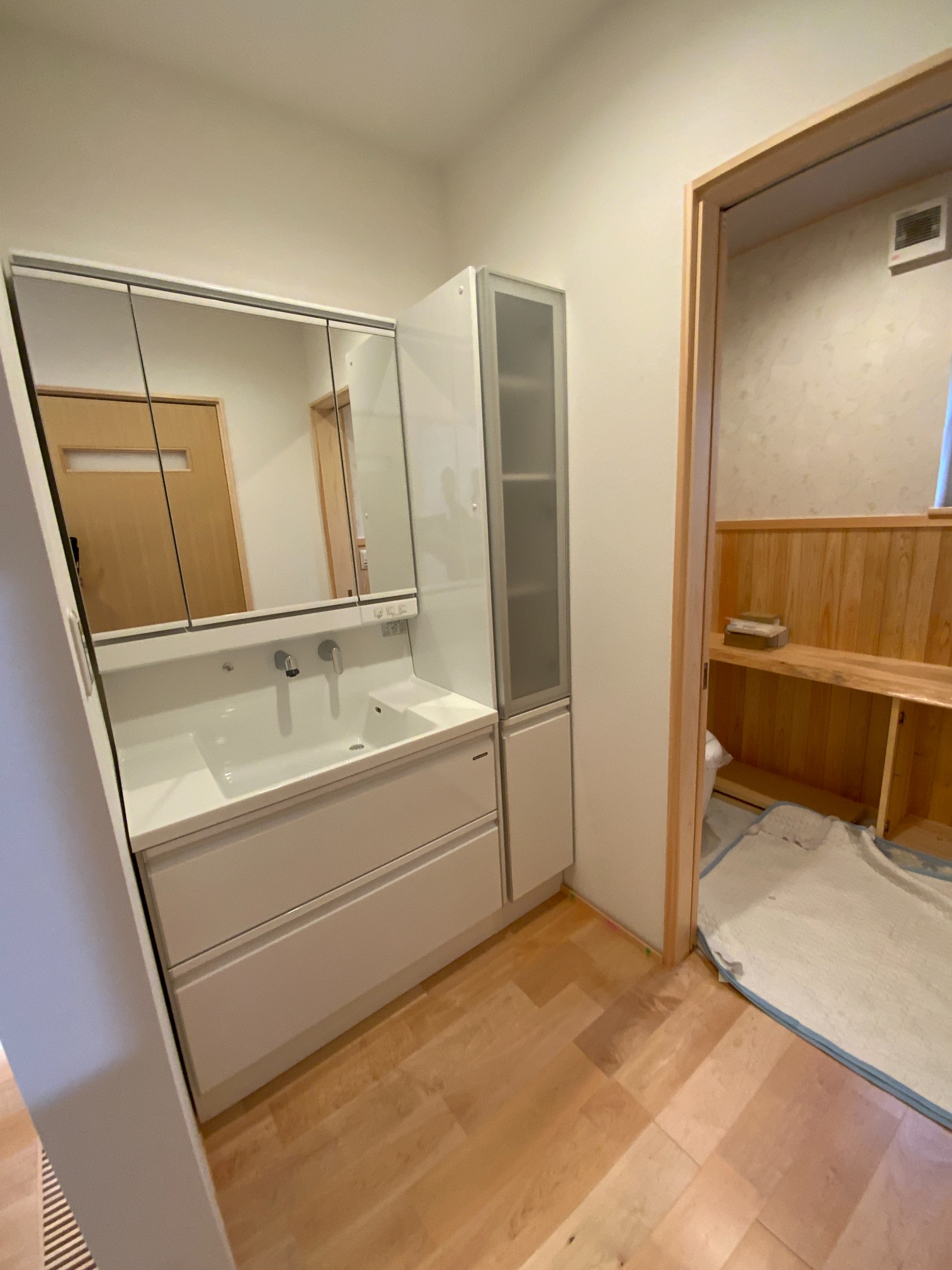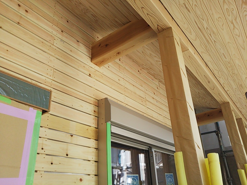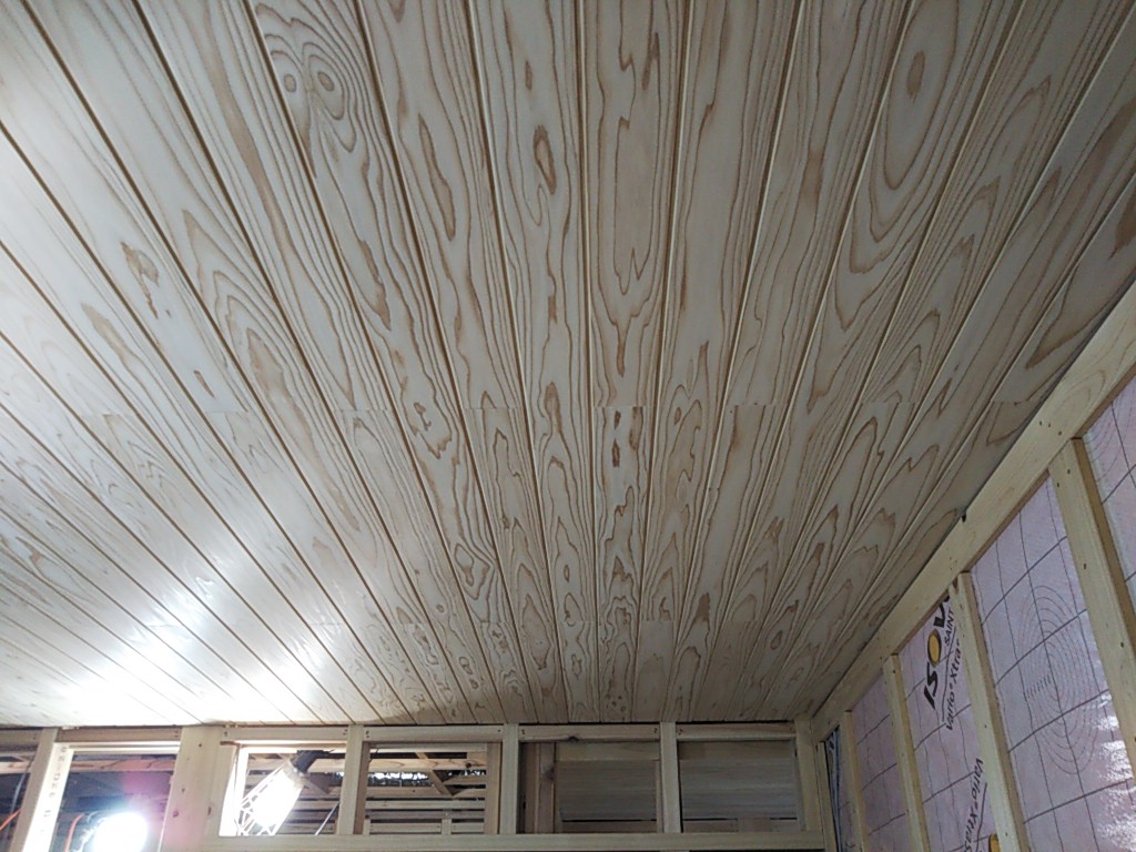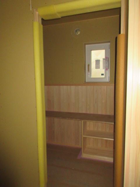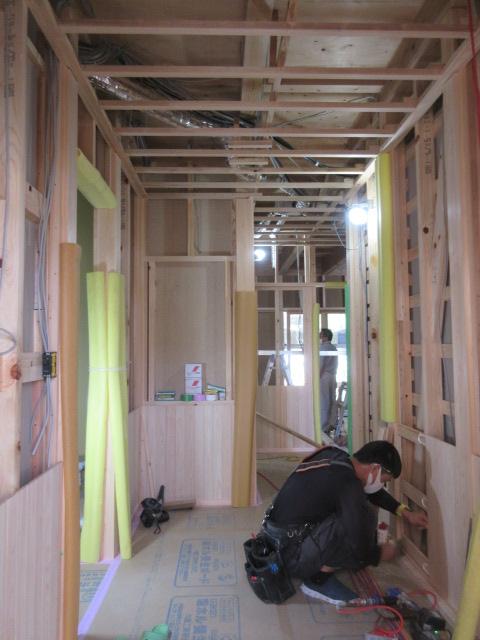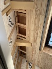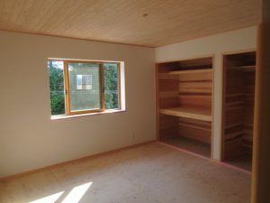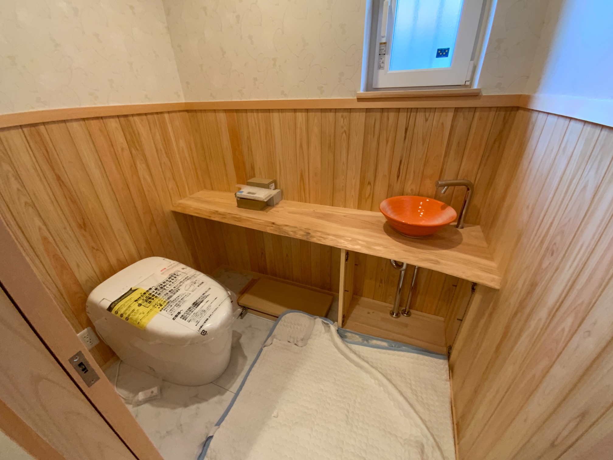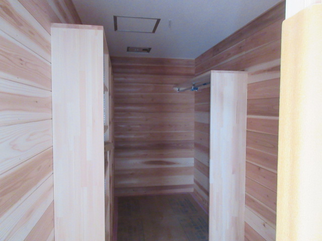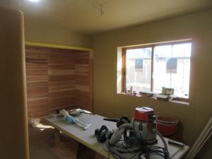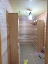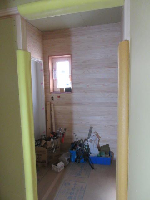 内部は壁の板張り作業が進んでいます。トイレとホールの腰板は桧材、脱衣室の壁は杉板を張っています。