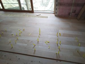 k棟梁は1階寝室の床を張っています。写真の手前に並べてある無節の杉板です。柔らかくて暖かくi様のお母様にも気に入っていただけそうです。守山区kt様邸の造作が終了したのでk池大工さんとh典大工さんが応援に入っていただき2階を造作中でペースUP。次の現場が始まるまで宜しくお願いします。