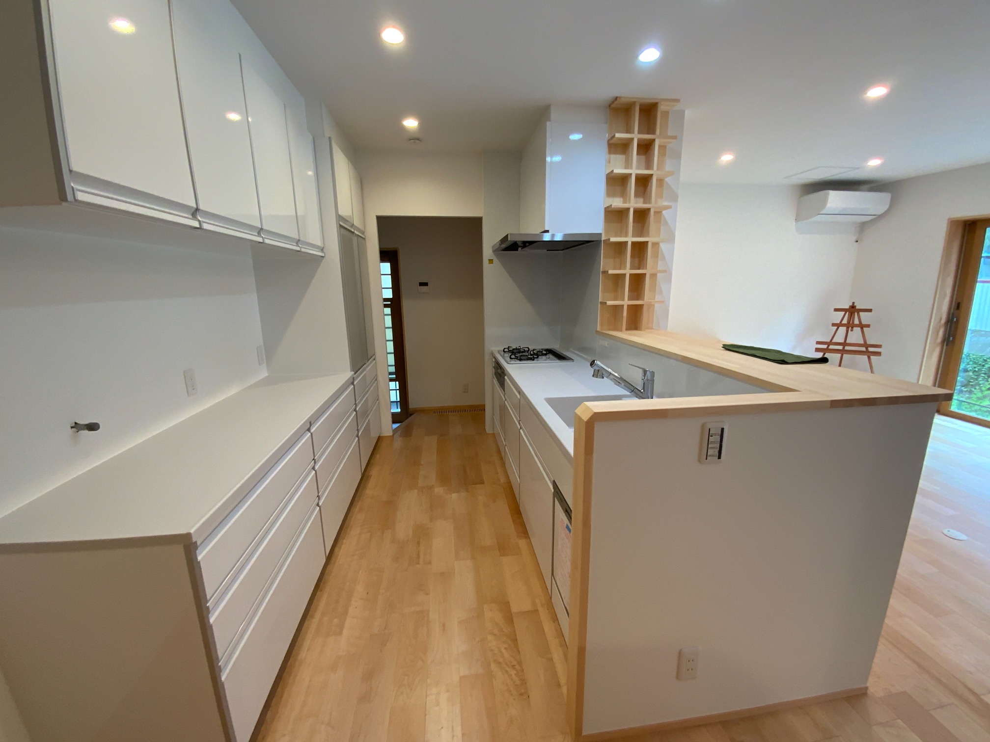 クロス工事が終わり、キッチンが設置されました。来週からトイレ・洗面など水まわりりの器具や、製作建具が取り付けられていきます。