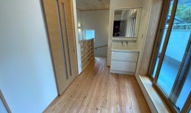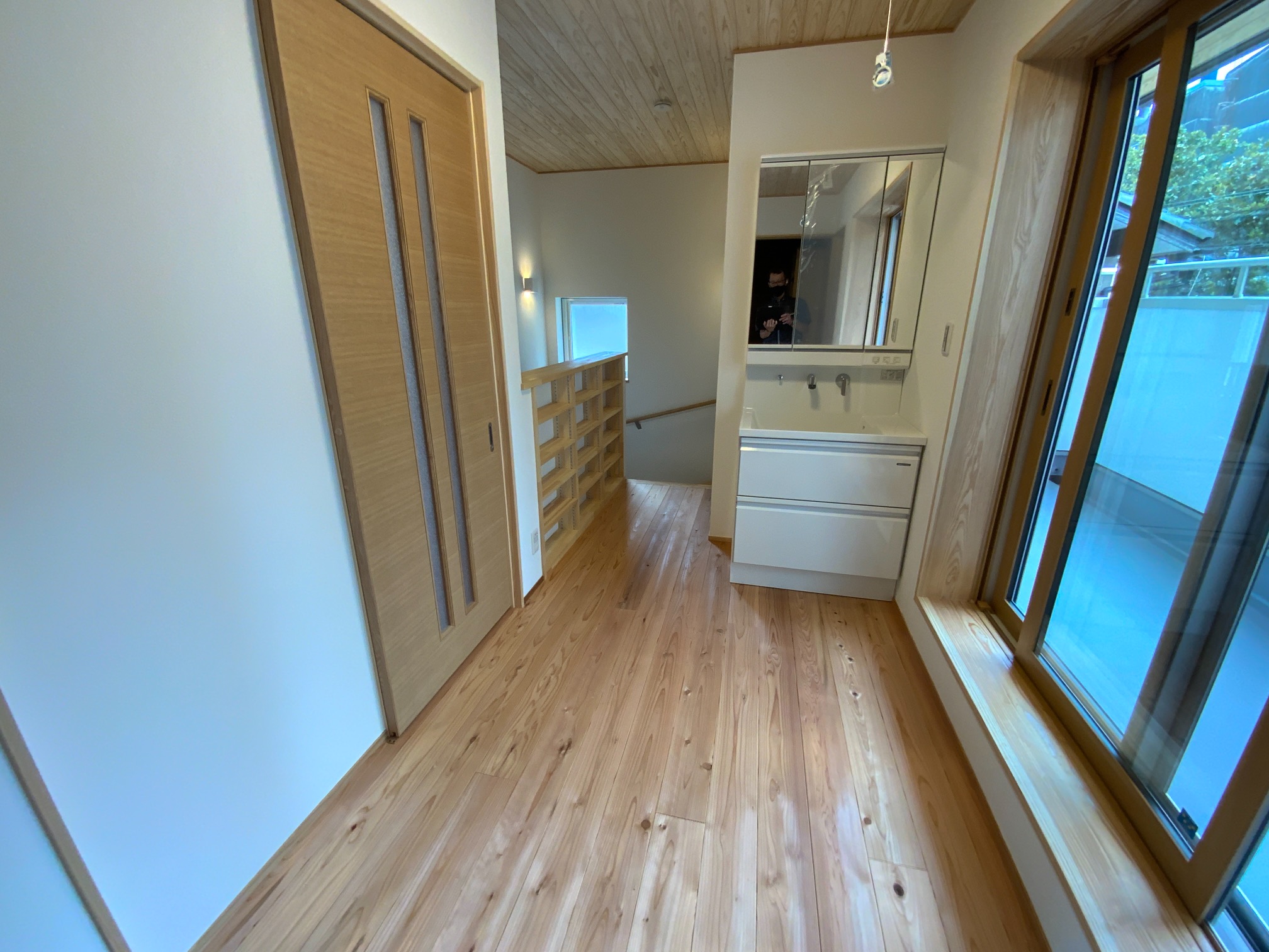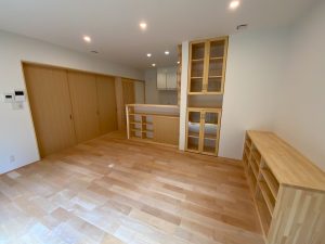 床養生がとれすっきりしました。1階床材は主に優しい色合いのメープル材、2階は足触りの良い杉材を使用しています。