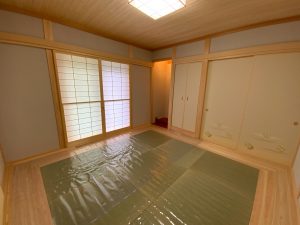 手作業が多いので、化粧柱を傷つけないようにすぐに養生カバーをしていきます。