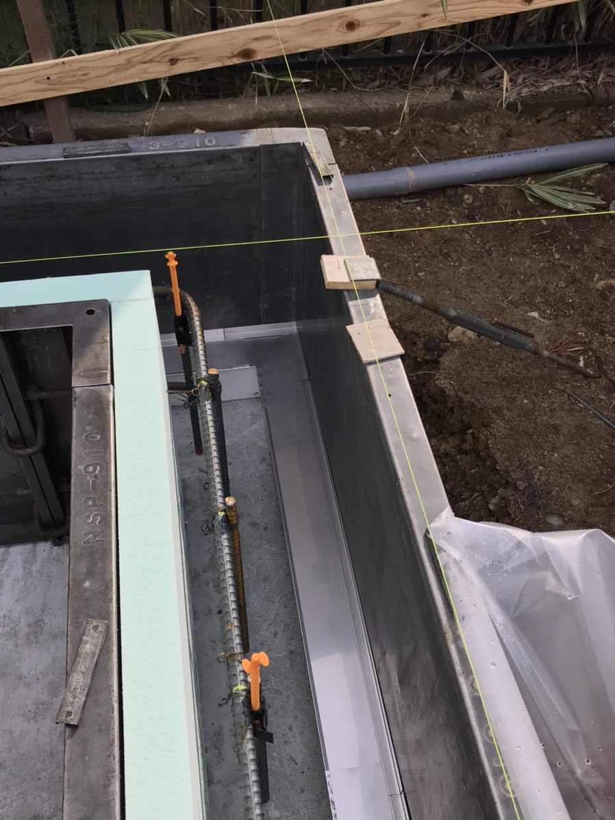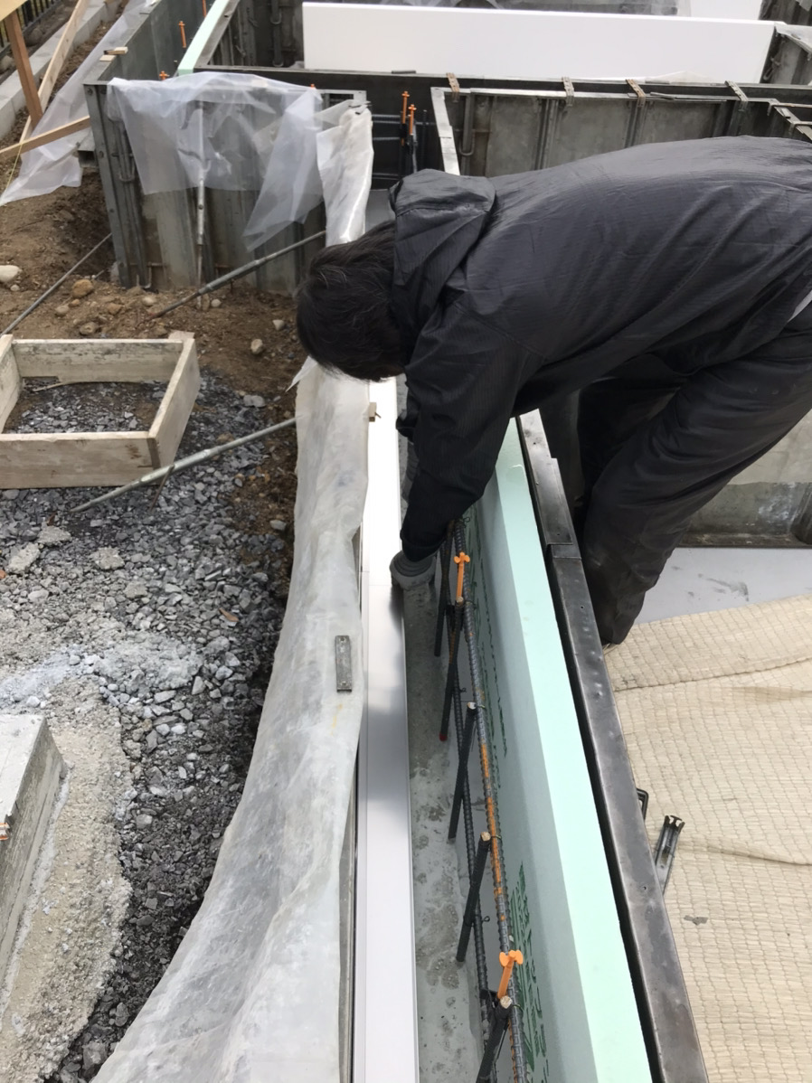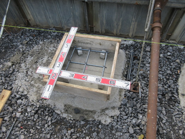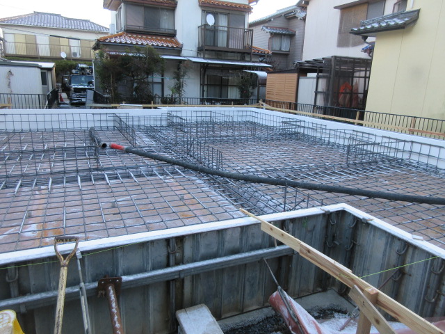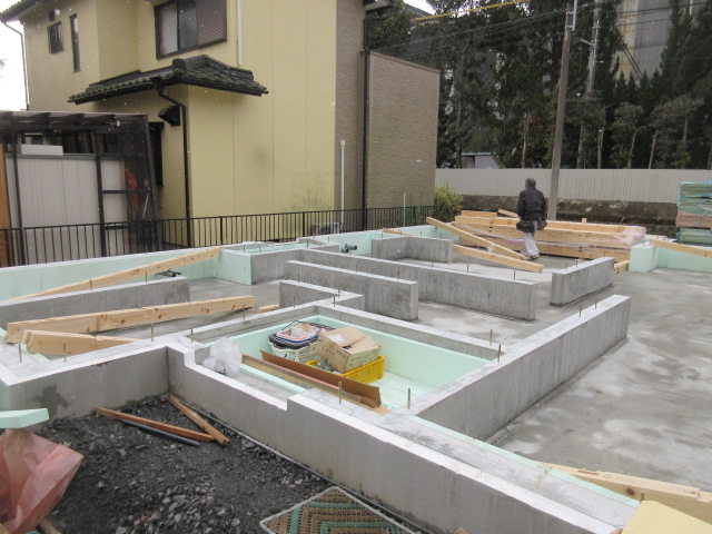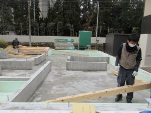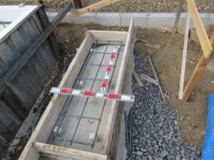 基礎配筋後のコンクリート打設待ちです。独立基礎部分にも木枠が作られています。