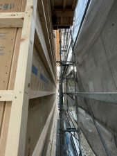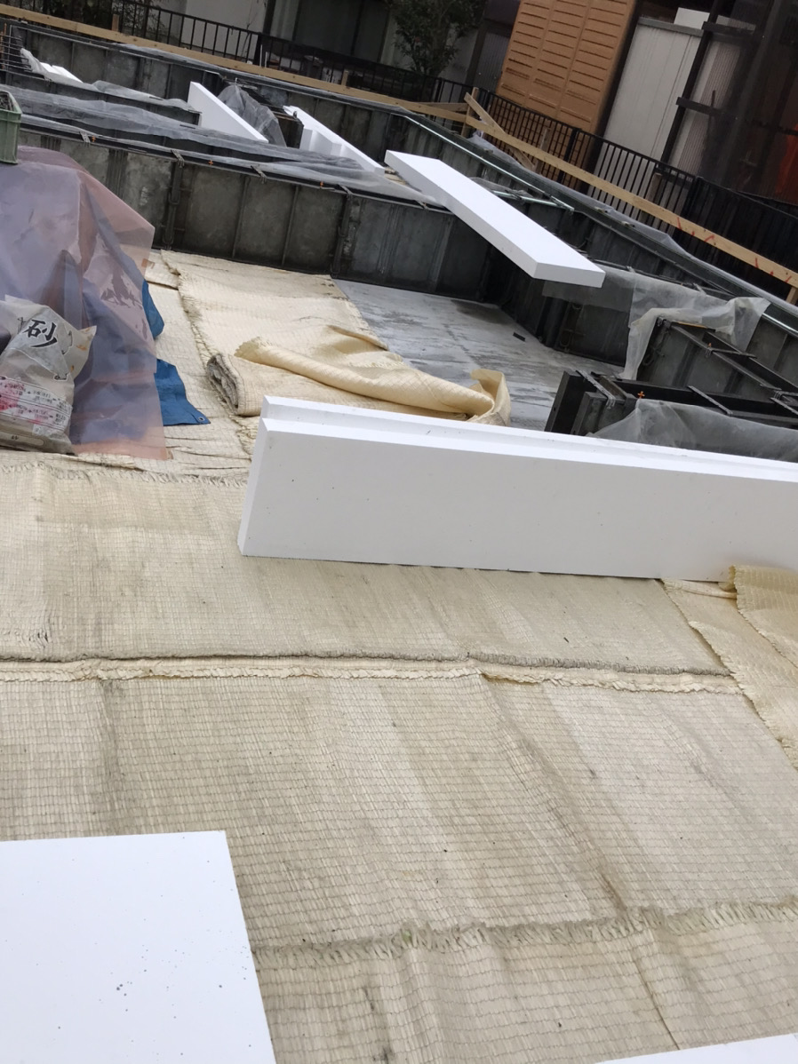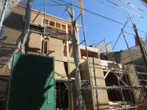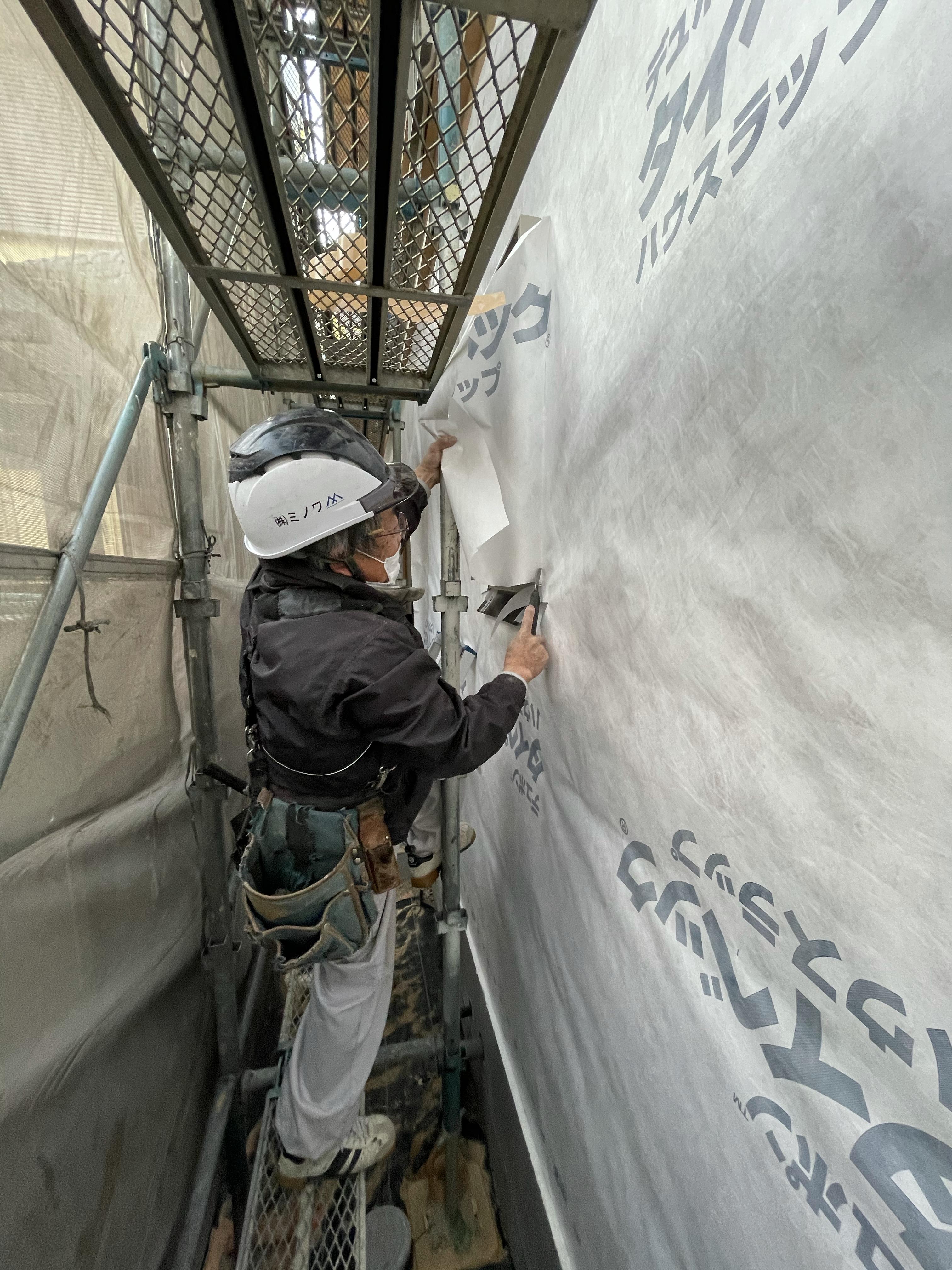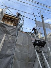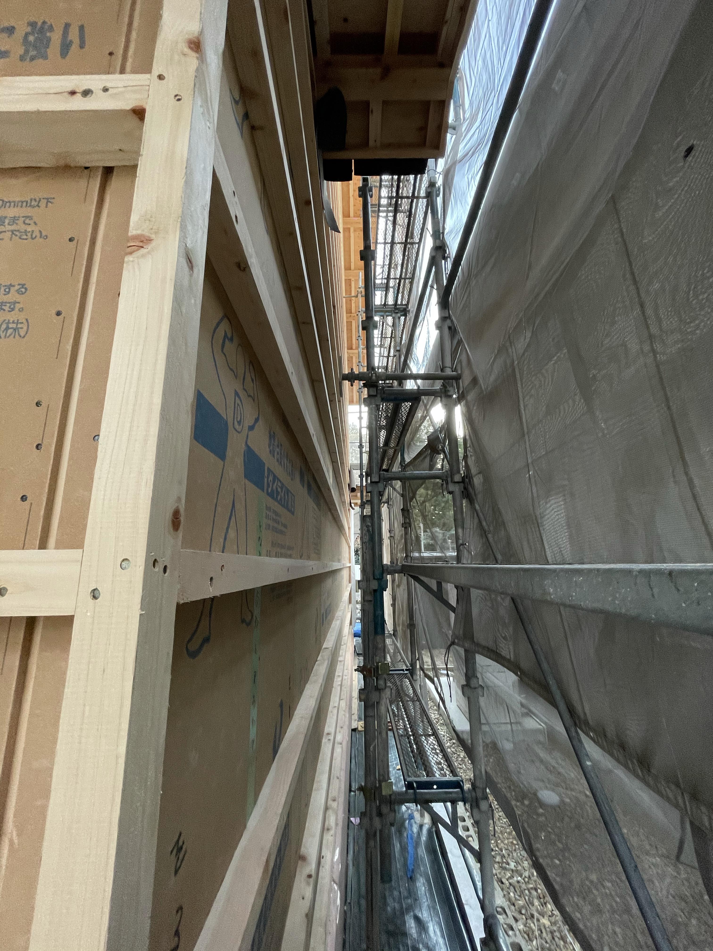 夕方現場にお邪魔しました。k大工さんは外壁側の断熱を進めています。足場を避けて3m幅の防水シートを貼るのはなかなか大変そうですが、