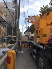 電線に干渉しない手前の方にクレーンで降ろし、そこから若手大工さんたちが運んでいきます。人数は少ないですがとても手際が良いです。