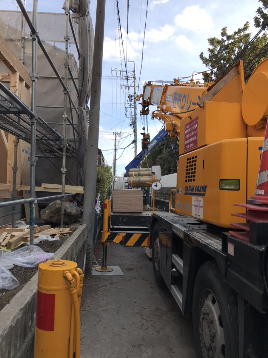 本日上棟1日目です。営業のk籐さんからリアルタイムで画像を送られてきました。今回の土地は旗竿地で、反対側の道路も狭いくため、クレーンでの搬入作業に制限があります。