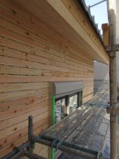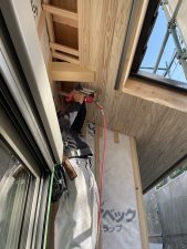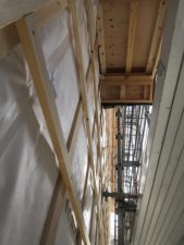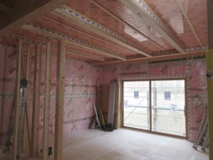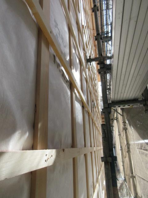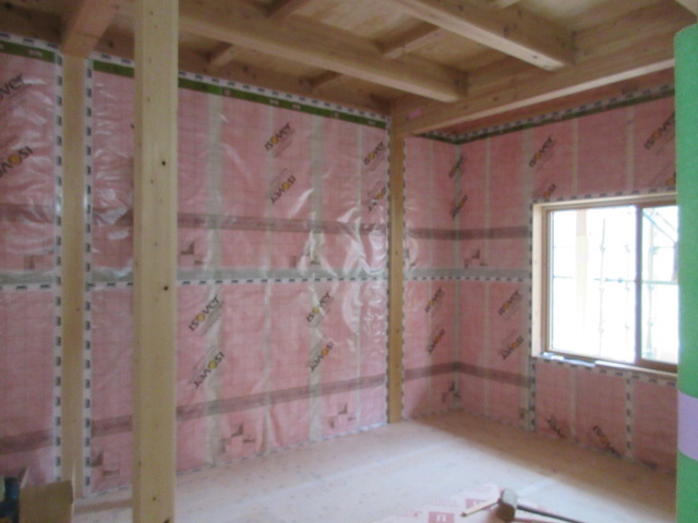外部は付加断熱は55mmの高性能グラスウール充填後、下地胴縁まで進み、この後ガルバリウム鋼鈑を張ります。今回の現場はガルバリウム鋼鈑と漆喰で仕上げが2種類あります。