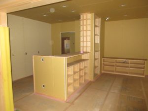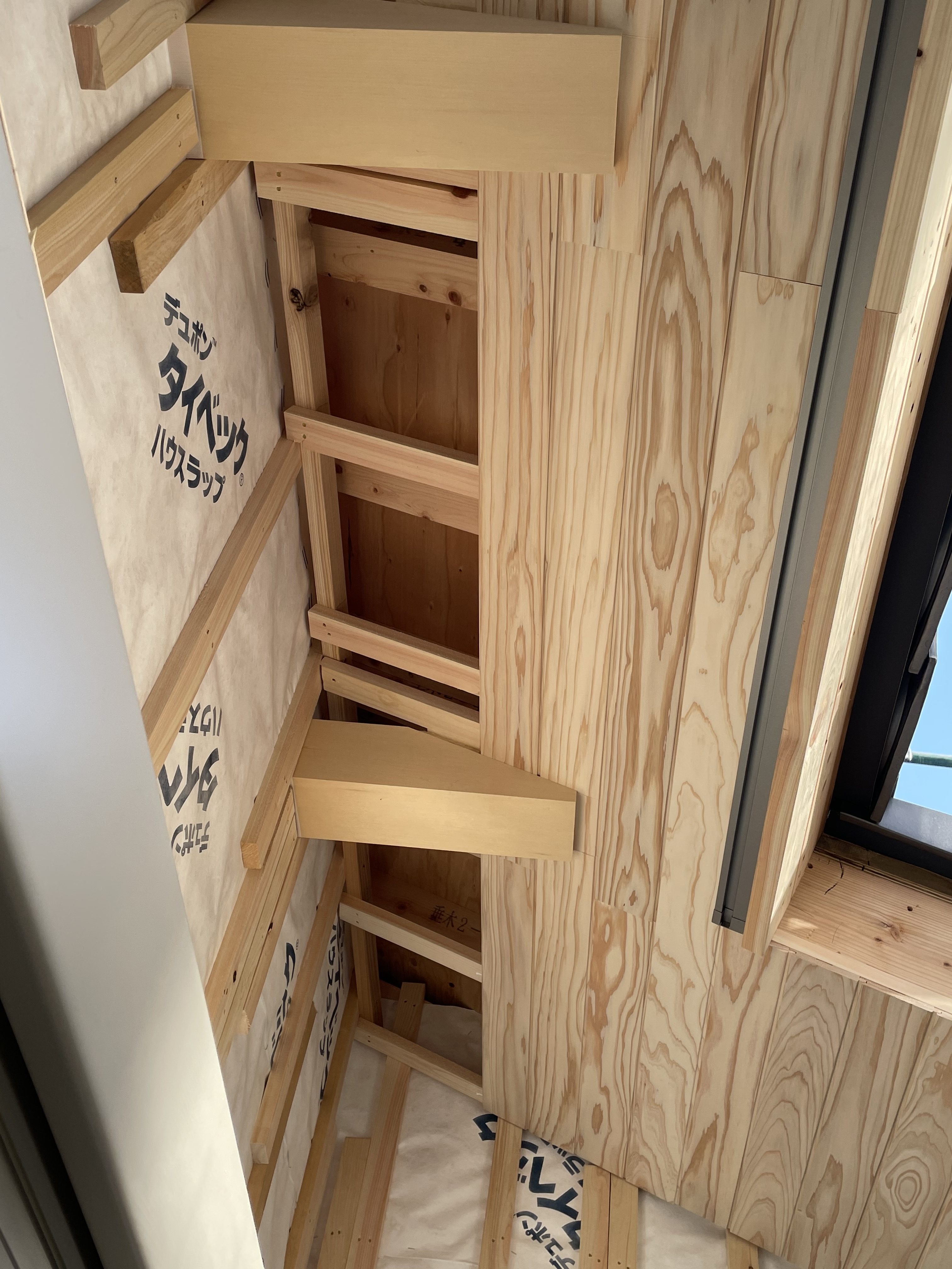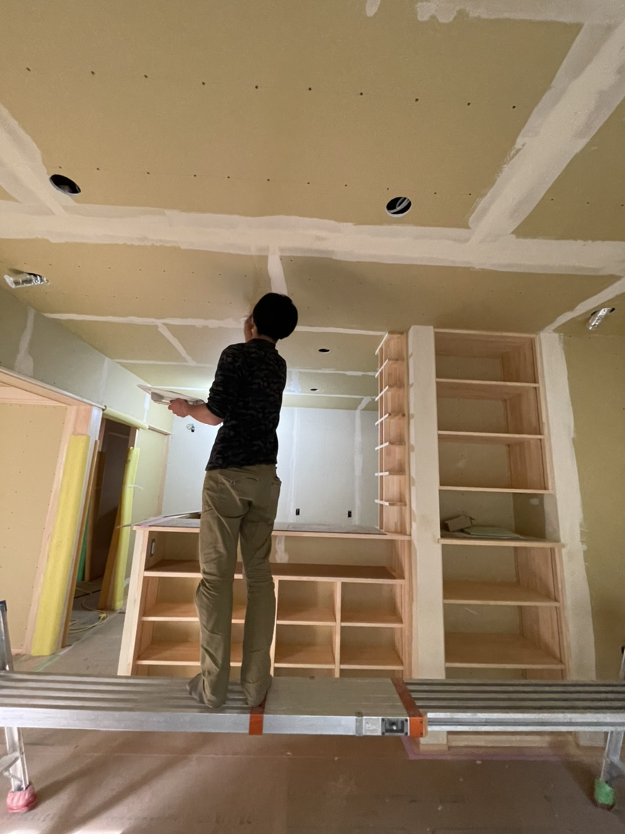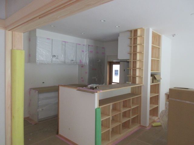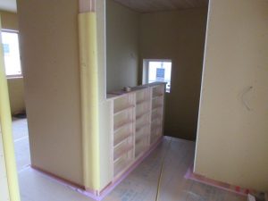 木工事が完了し、各所の造作棚も仕上がりました。キッチンカウンター部にはカップなどが飾られる予定です。来週から内・外壁の仕上げに入ります。