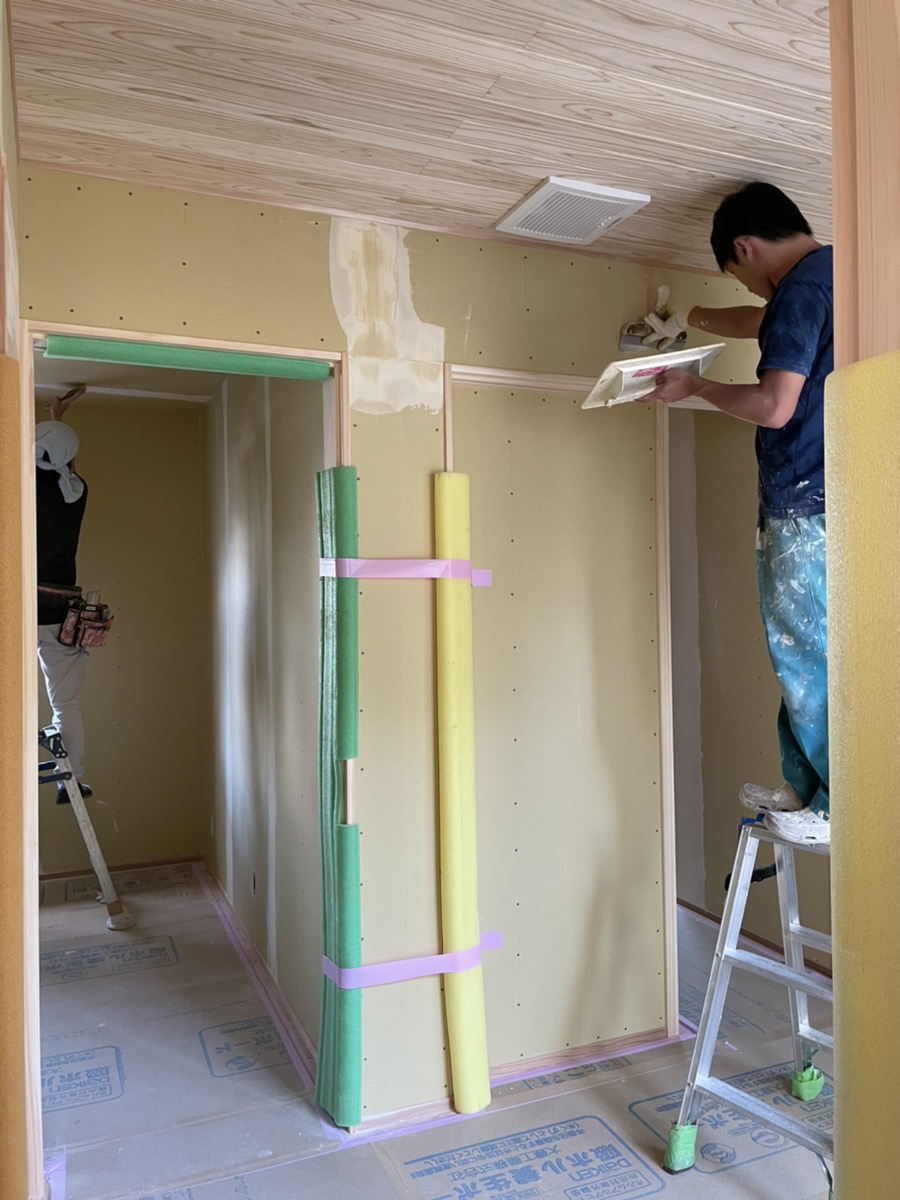 内部は3人の職人さんによる天井・壁のパテ埋め作業中です。