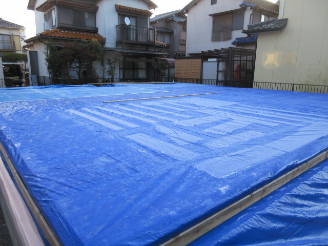 棟梁kさんと愛弟子h谷川君ペアで土台伏せです。養生もしっかり施されました。週末の上棟を待つばかりです。