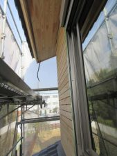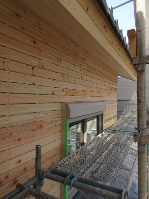 軒裏の杉板を取り付けているK大工さん。軒の出を支える腕木と外壁の隙間に板をはめ込むのは狭くて作業しにくそうです。