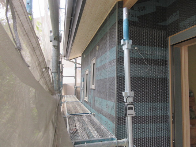 外壁通気胴縁に木摺(ラス下地)が施されました。