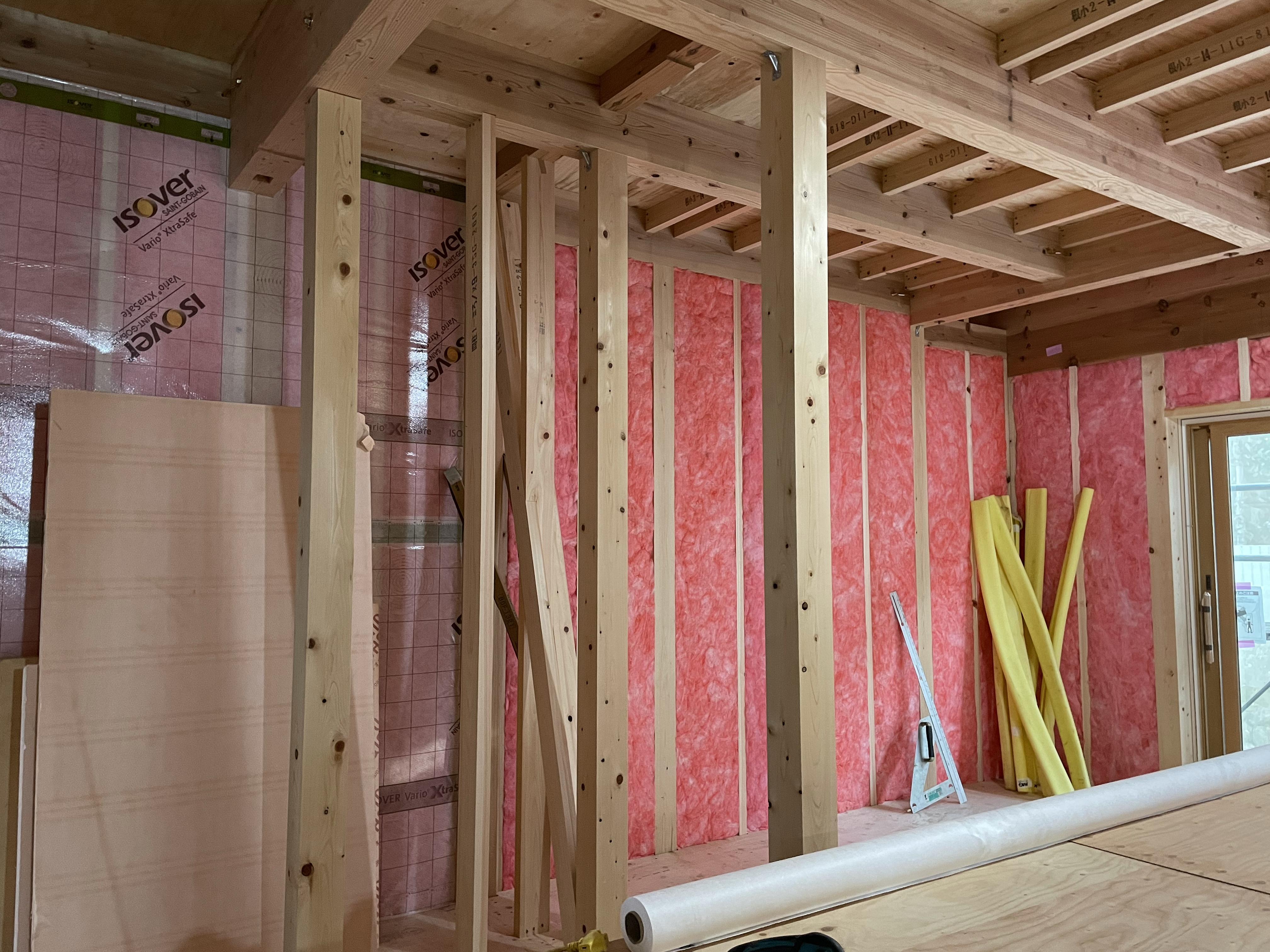室内の断熱材施工が完了しました。内壁側は120mmの高性能グラスウールが充填されています。LDKの天井上にはバルコニーと下屋があるので、薄くて性能の高い断熱材を使用しています。