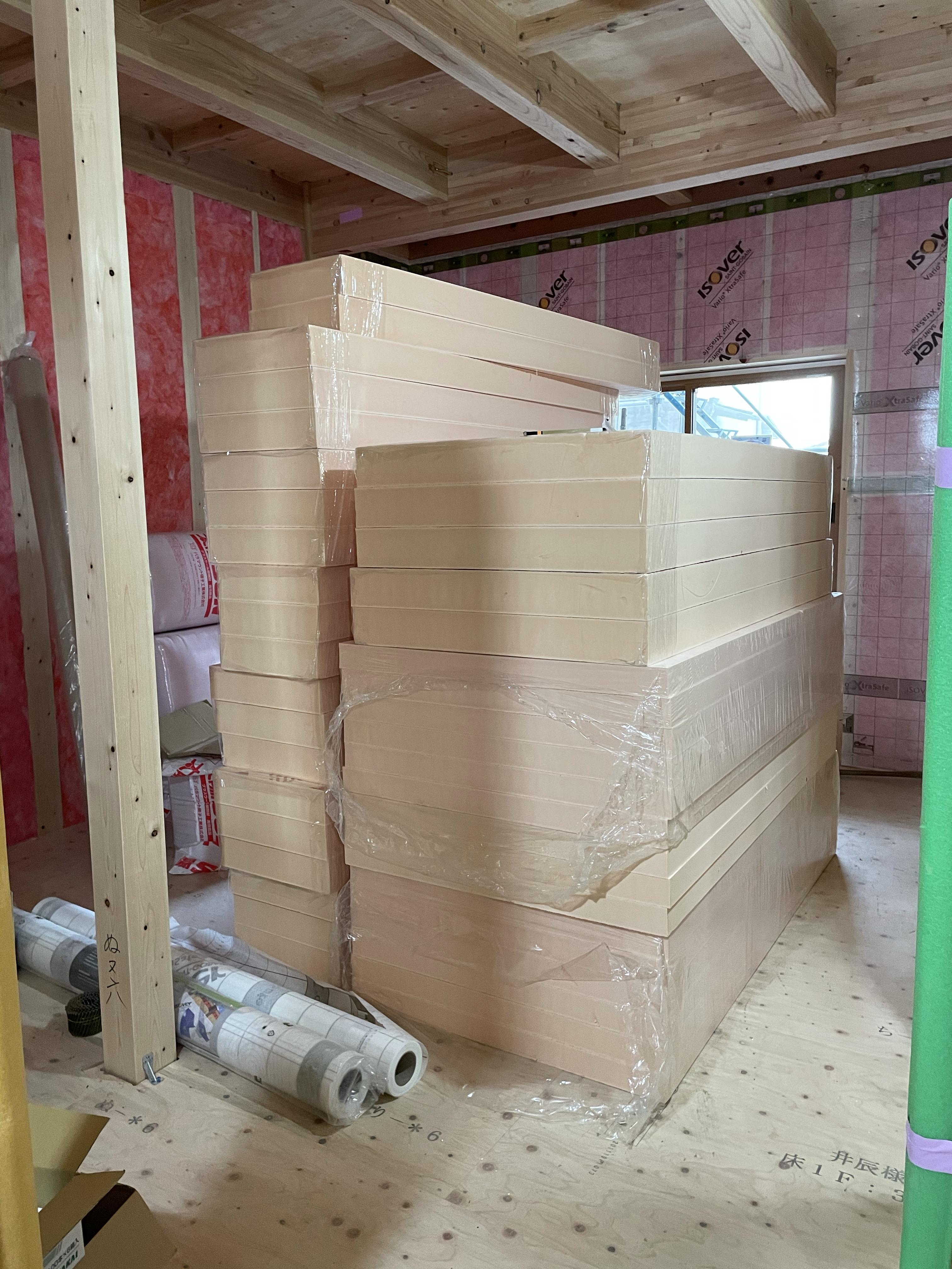 kさん、相変わらず丁寧な作業です。山積みになっているのは下屋部分の天井用ボード系断熱材です。