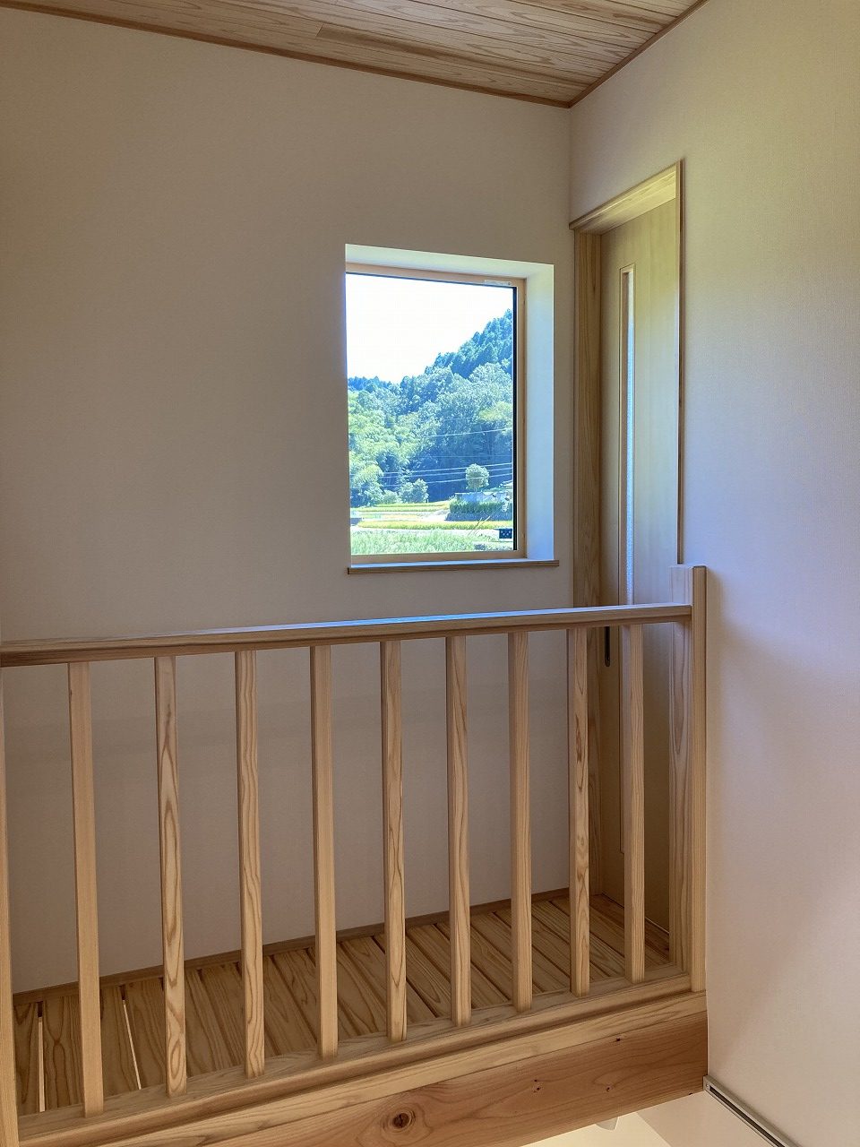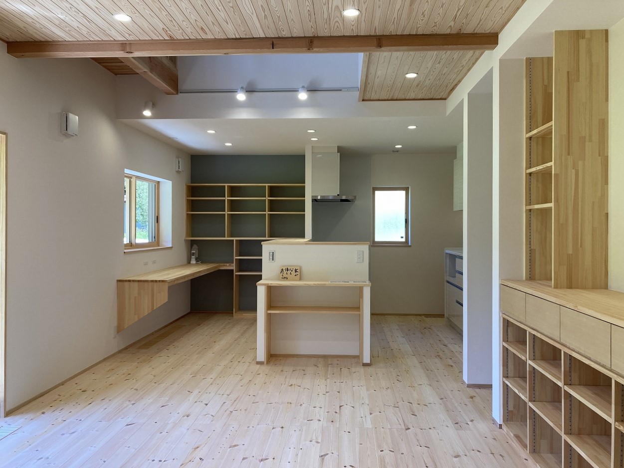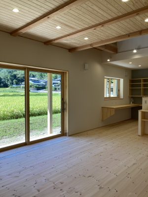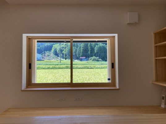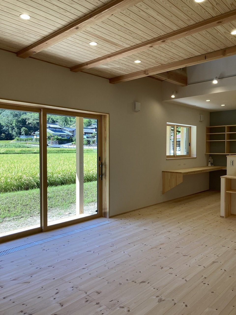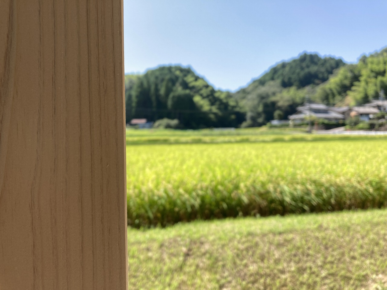 SCL付の玄関からLDKに入ると、9尺(約2500㎜)の窓からは、稲穂がきれいな田んぼの景色。窓枠が額縁の様です。キッチンからもその景色を楽しみながら、お料理できる配置になっています。