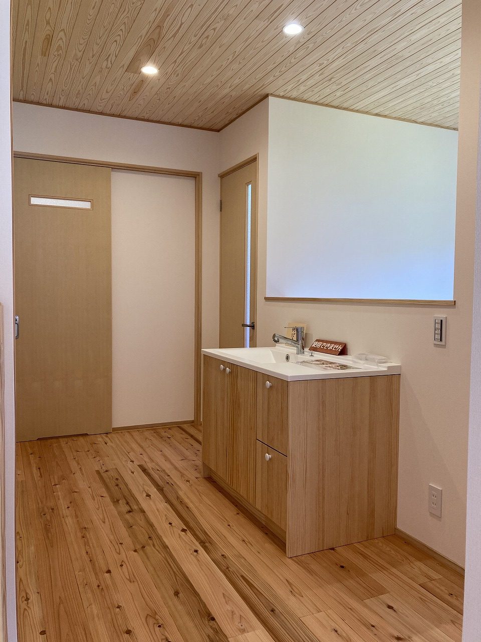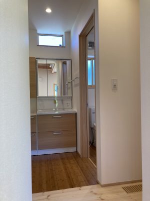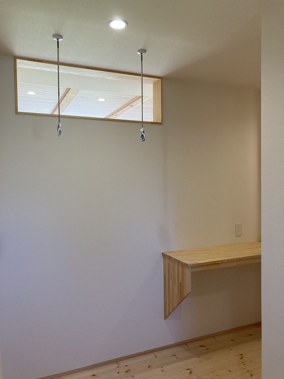 キッチンの裏は、水廻り(トイレ⇔洗面⇔脱衣室⇒浴室)が並んでおり、その近くに物干しスペースが確保されています。高気密高断熱のミノワの家は、乾燥しやすいので、夜干された洗濯物は朝にはほぼ乾いている事でしょう👍