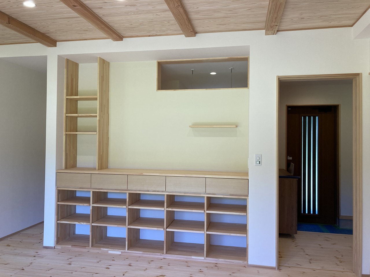 LDKの一角には、ご家族それぞれの収納がしたいとの事で、引き出し付きの収納棚があります。リビングでそれぞれくつろぐ時に使いたい物があるので、そういうスペースを確保するものいいですね👍そうだなぁ~私は、ハムストリングスをほぐす道具や、my爪切り、myブランケットを入れさせてもらいたいかなぁ。