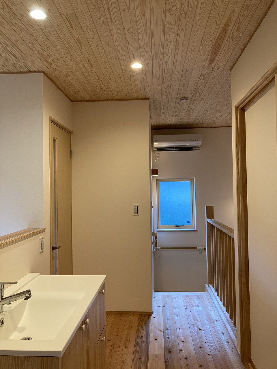 LDKの上には3畳程度の吹抜けがあり、2階の廊下兼洗面スペースと繋がっています。1階LDKと2階のホール(共用部)に冷房用のエアコンを設置し、2台で家全体の冷暖房を行う計画です。