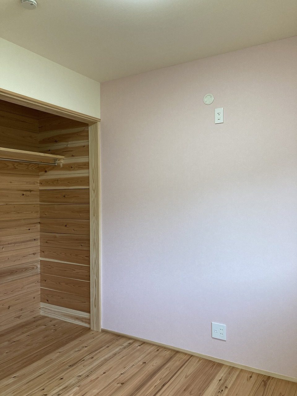 2階の寝室は、またまた「川の字スタイル」畳敷きの寝室です👍家族4人で360度回転しても安心ですね(笑)。お子さんのお部屋は、密かなブームのクローゼット扉無しパターン。個室のクローゼットやウォークインは、その部屋の持ち主だけが見る場所なので、扉は無しにしたり、ロールスクリーンにされてもいいです。メリットとしては、後から入れる引出しなどが枠に当たらない、空気が循環するので匂いや湿気がこもらない、建築コストが下がるなど・・・デメリットとしては、急に友達が遊びに来て、「お部屋見せて~」と言われた時にいろんな物を押し込めれない💦でしょうか。