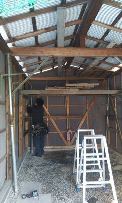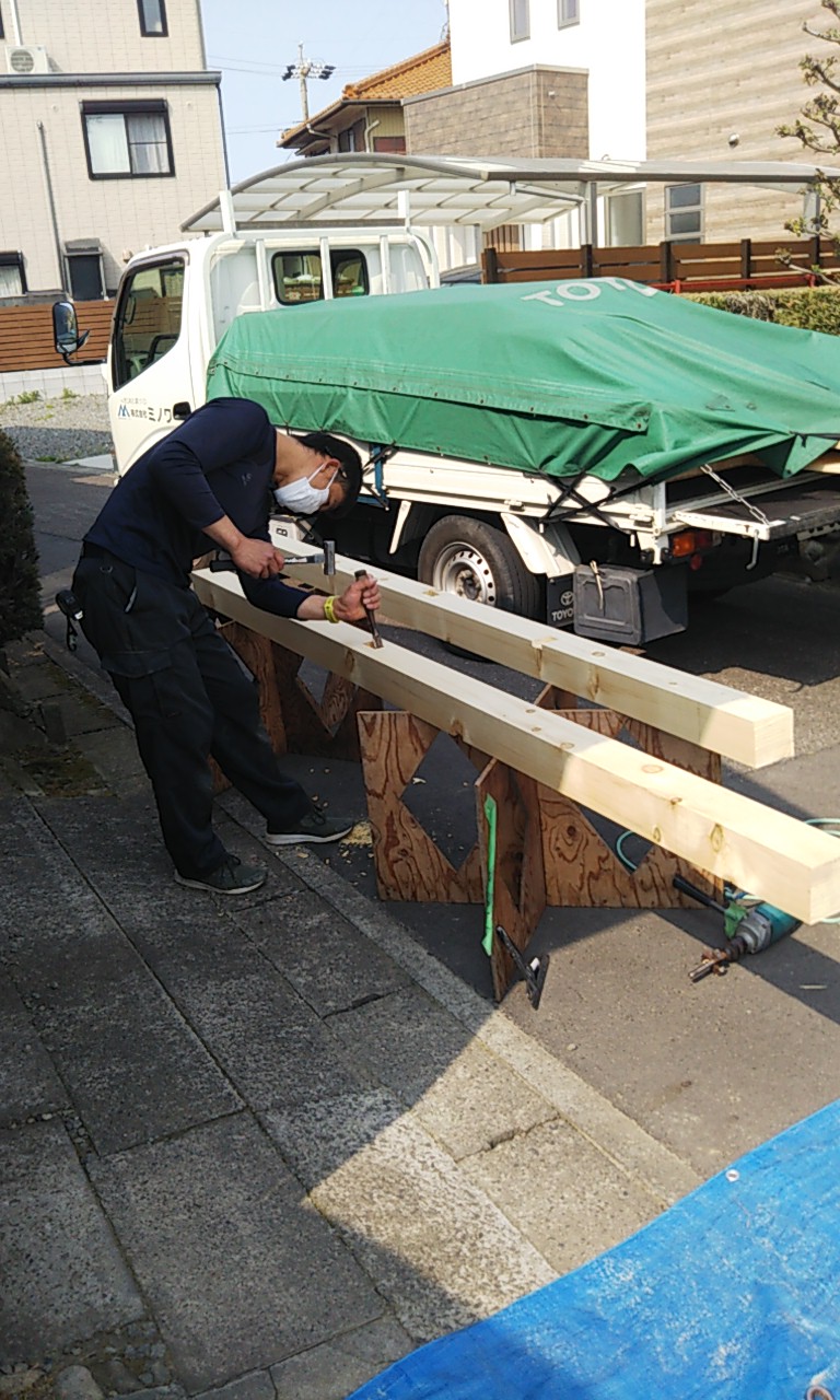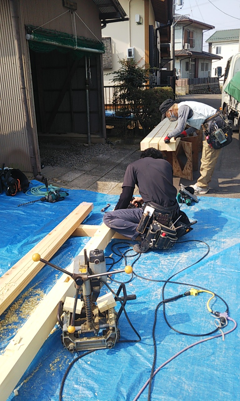 土台のみを交換する工事に着手。コンクリートの工事で使用されるパイプサポートを使って土台以外をジャッキアップし、旧い土台を撤去。新たに米ヒバ材で作った土台を差し込む方法としました。言うは易し行うは難し。たった5本の土台を入れ替えるだけですが、地味に人数は必要となってきます。下ごしらえの段取りは人数がいる分手早くできます。