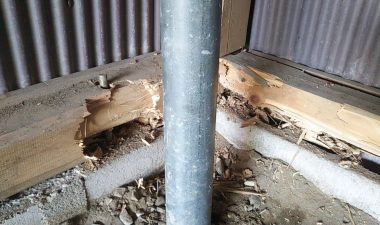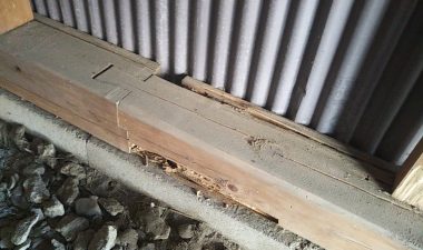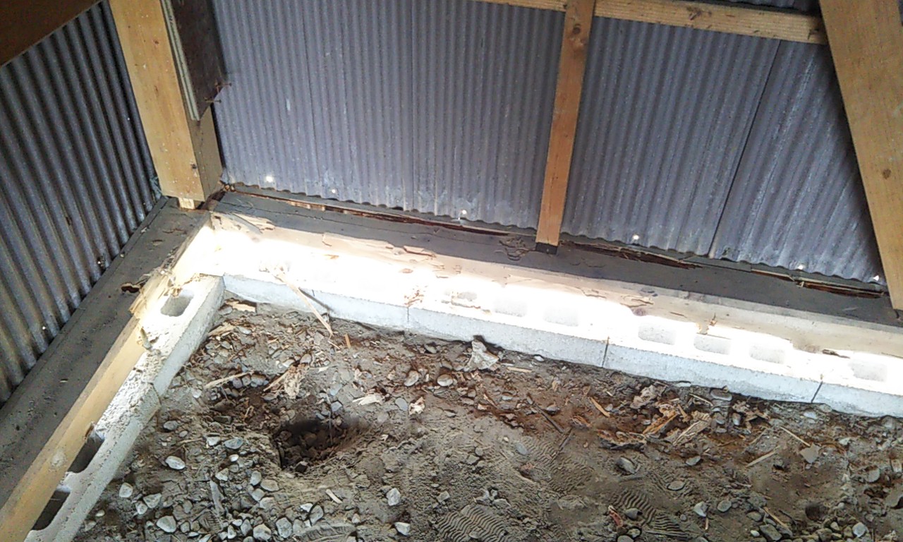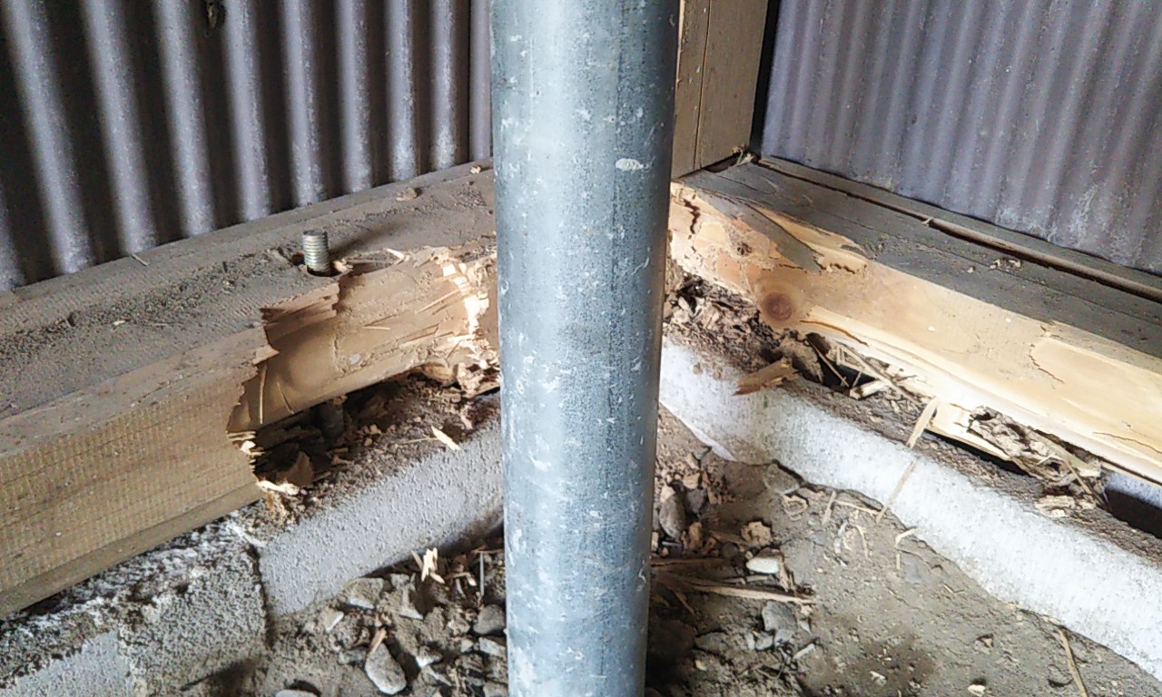 江南営業所のご近所さんから『木材とトタンで建てた車庫の土台が白蟻に喰われているけど補修できますか?』とのご依頼を受けました。さっそく現地を拝見すると、ブロックの上約5㎝の部分に据えられた土台がだいぶ喰い荒らされているのが分かります。建てた当初は防蟻剤などは塗布されなかったようです。