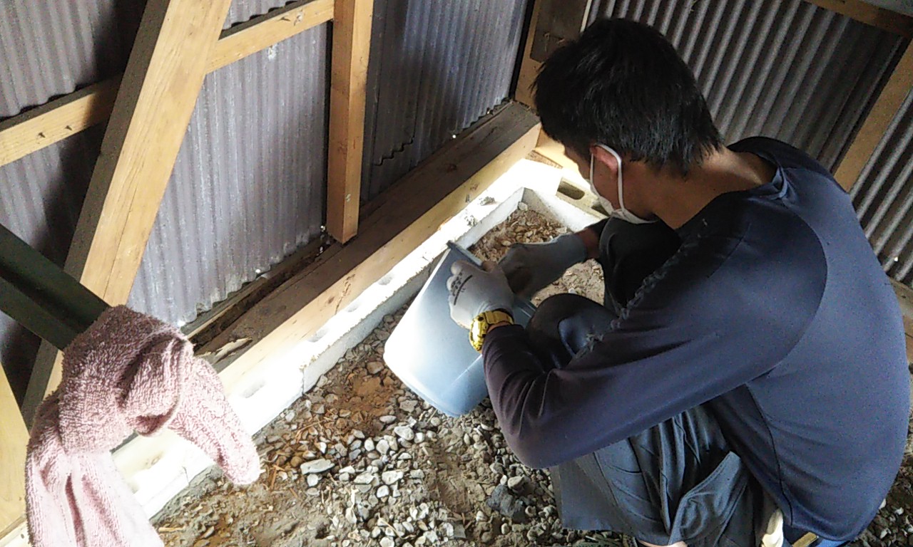 防蟻防腐塗料を塗っておきます。しばらくは白蟻も寄り付かないかもしれませんが、何年かに一度は塗り直していただきたいと思います。