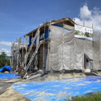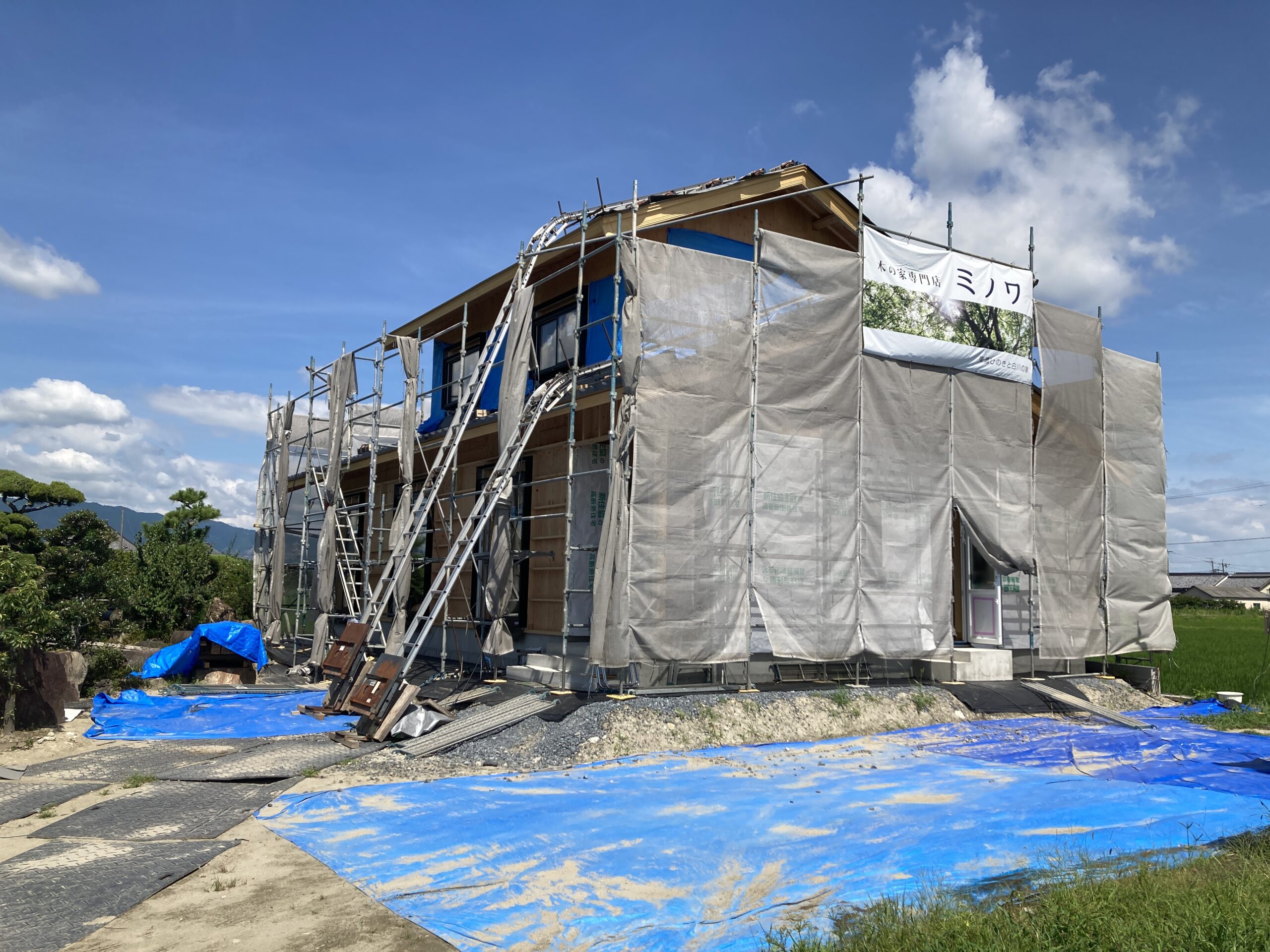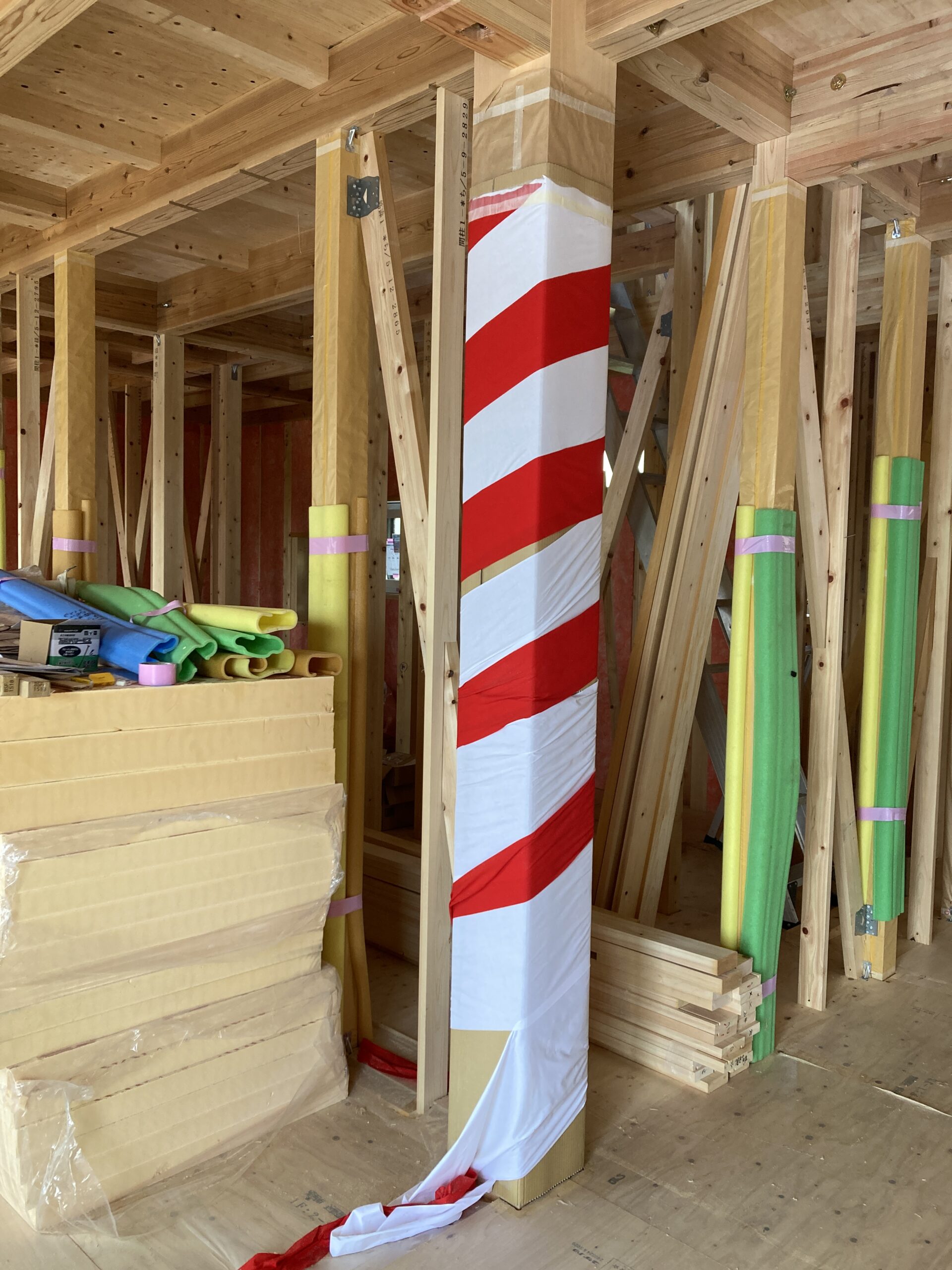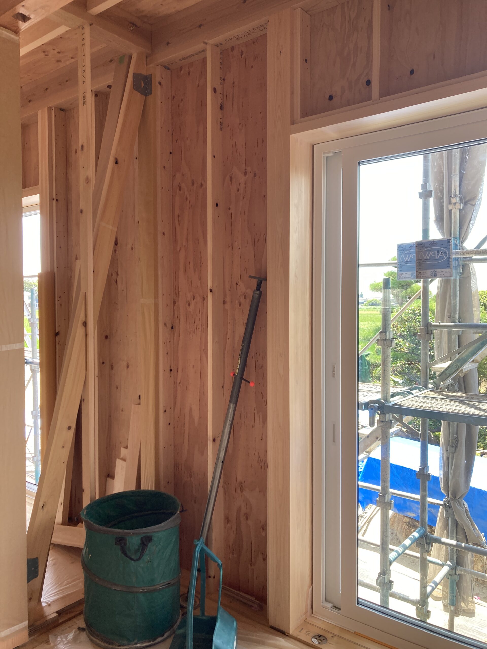 とは言うものの、東西と北側は、k棟梁が鰻を食べて頑張ってくださったお陰で付加断熱が施され、屋根はk嶋屋さんも命がけで1階部分をほぼ瓦を葺き終えてくださっていましたので、現地の玄関扉を開けると中は涼しく、ビックリ👍夏の日差しを遮る庇や、足場のシートもあるおかげで、ご案内中も皆様「思ったほど暑くないね」とおっしゃっていました。