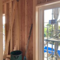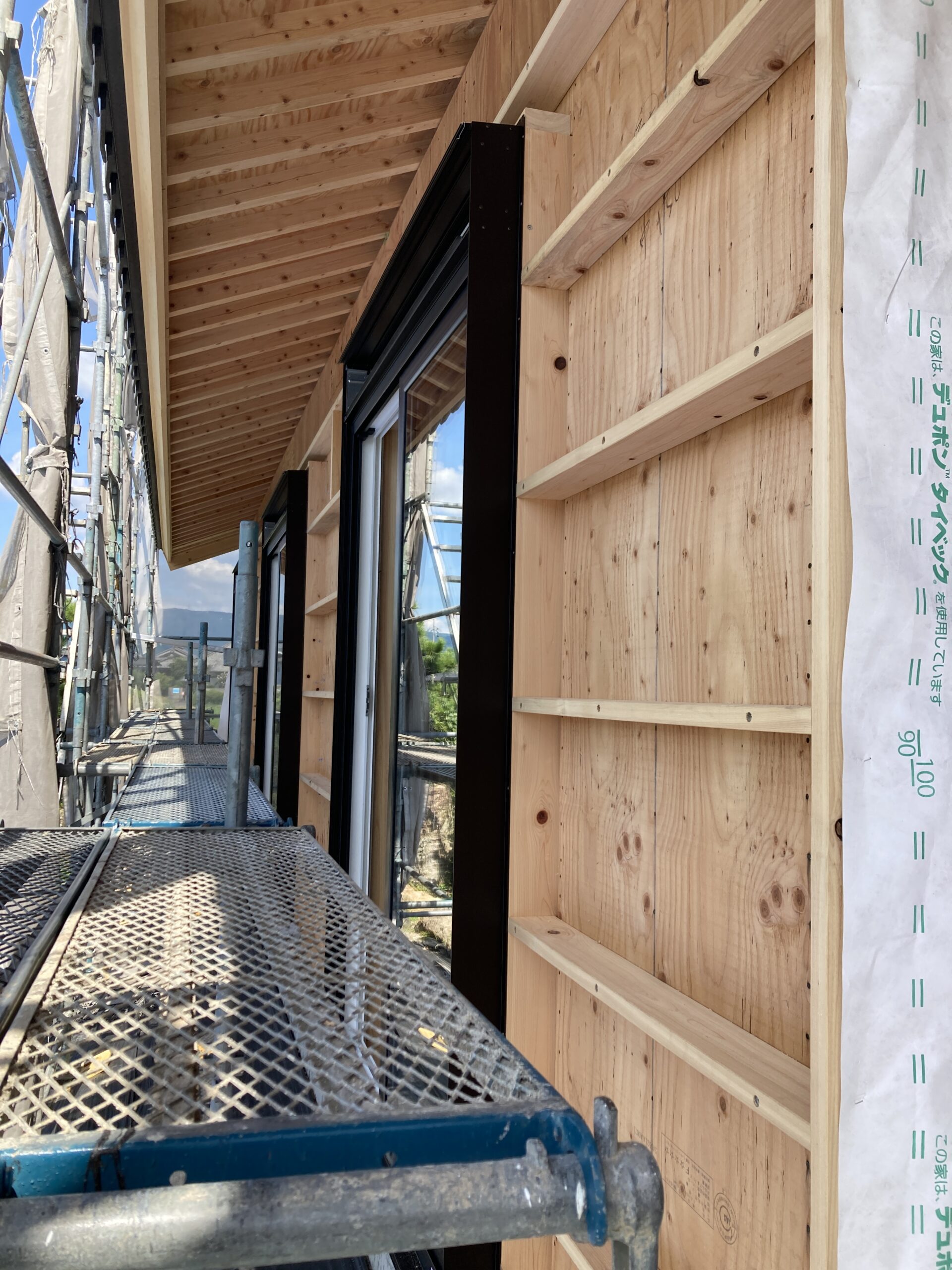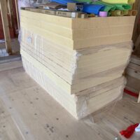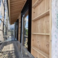 外部の付加断熱(文字通り:断熱を付け加える)を入れる為、下地を施している様子です。柱が縦方向に入っているので、下地を直交させることによって、断熱材が柱を覆う事になるので、最近はこちらのやり方にしています。省エネ基準の申請の際には、計算でこういったところまで数値としては出ませんが、『新住協』の温熱環境計算システム『QPEX』では縦張りと横張りでは数値が変わって出てくるようになっています。