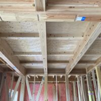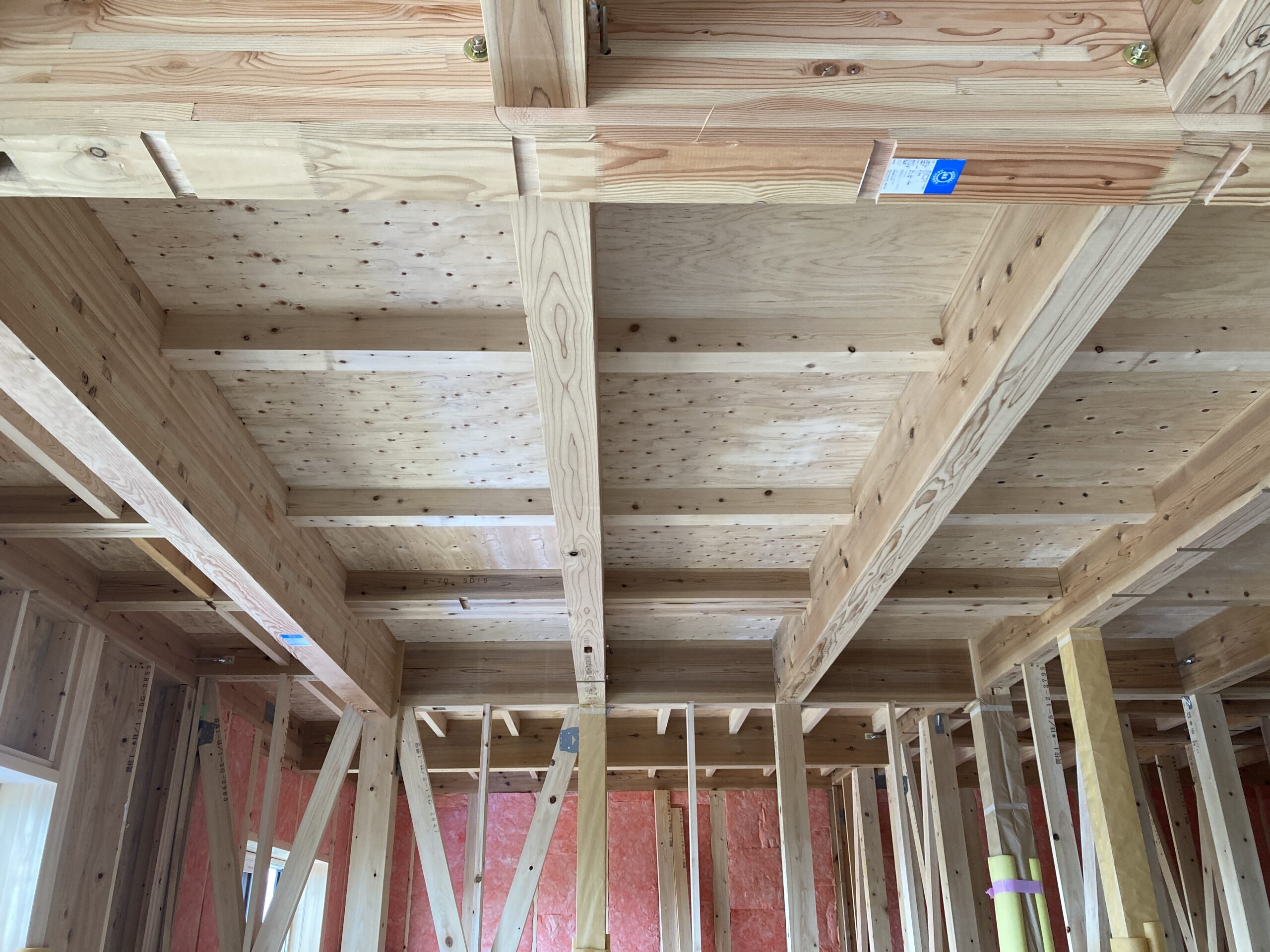 構造は、許容応力度計算による耐震等級3を標準としています。今までは品確法の壁量計算による耐震等級3で、安全側で太くしていた梁や柱は、計算によって、せいを低くしたり細くすることが可能になりました。と言っても、柱は変わらず120角を標準とし、外壁の断熱層の厚みを確保しています。k様邸は、2階部分が小さい和風住宅。2階の外壁面が1階の外壁面と合わない部分があり、2階外壁面が載る梁には荷重が多くかかるので、集成材の梁が採用されています。