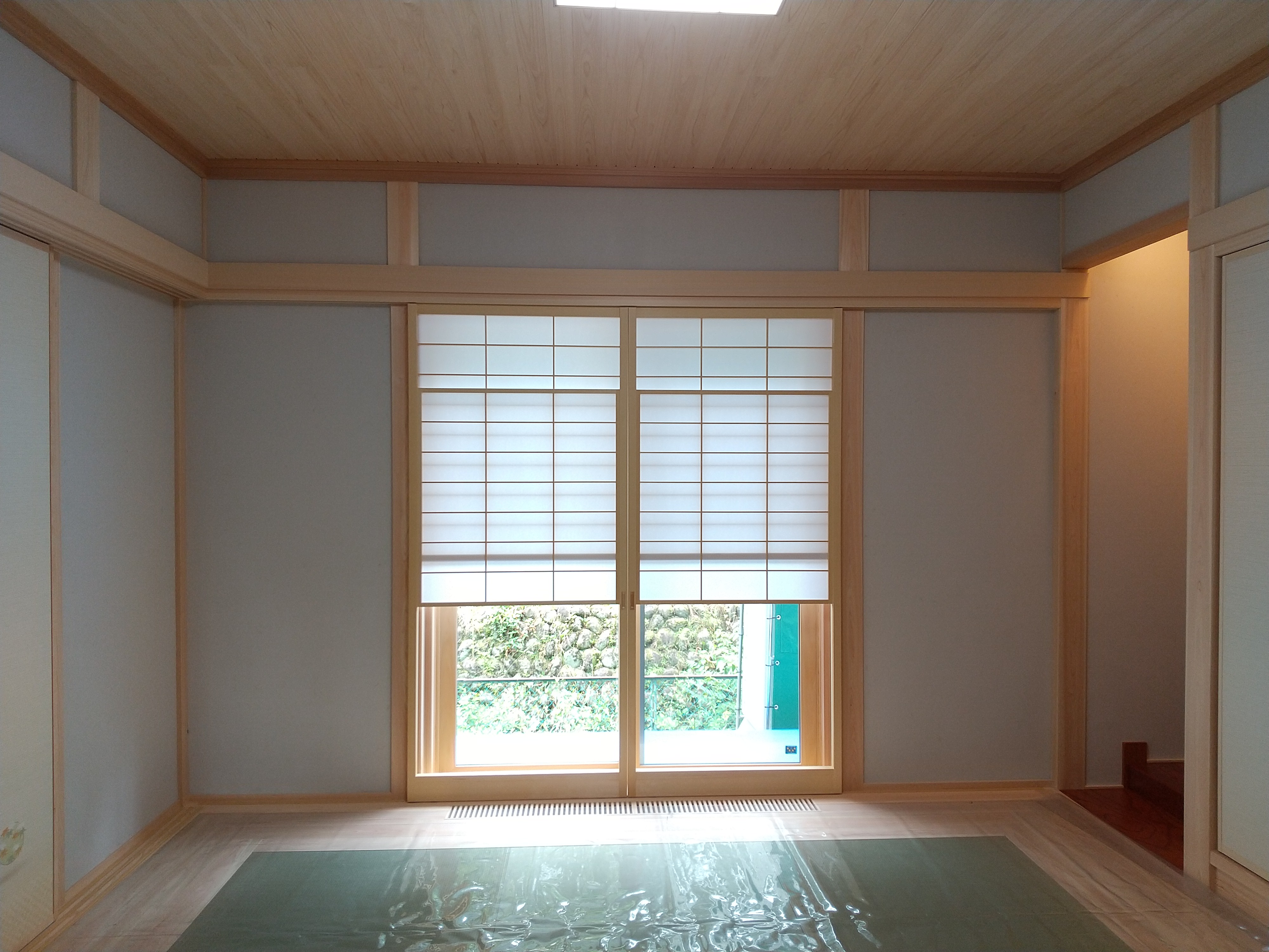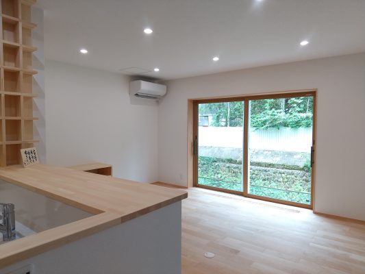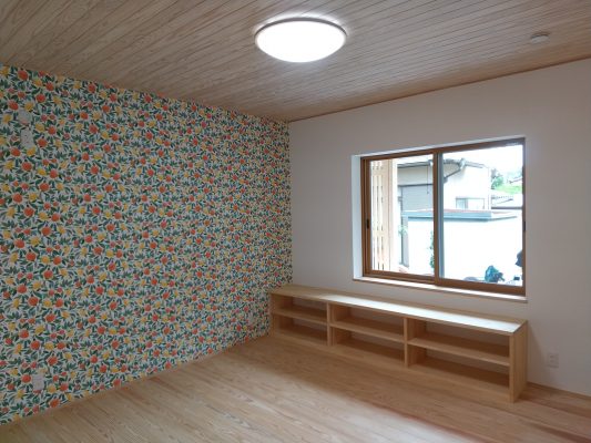 ダイニングキッチン、和室からは、小道を挟んだ工場の植栽と玉石積みがいい感じに借景となっています。お母様の寝室は北側ですが、美味しそうな明るいクロスを選ばれて、楽しく過ごせそうです。