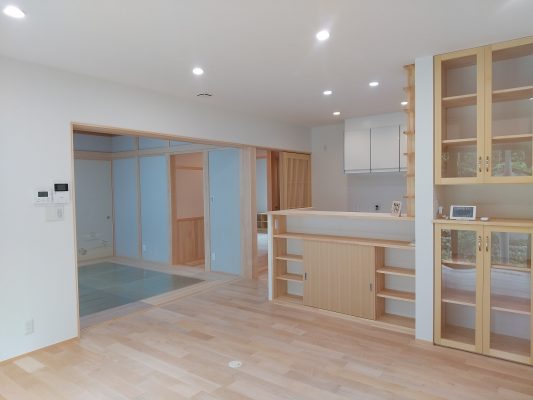 完全同居型二世帯住宅なので、水廻りは共有の為、「くつろぐ空間はたまには仕切りたい」「仏間のある和室も欲しい」と言う事で、広めのダイニングキッチンに仕切れる和室リビングがひっついた間取りになっています。無駄な廊下部分も少なく、1階の居室の引き戸を開けっ放しにしていただければ、高断熱高気密の家なので、LDKに付けたエアコン1台で空調管理できる配置にもなっています。