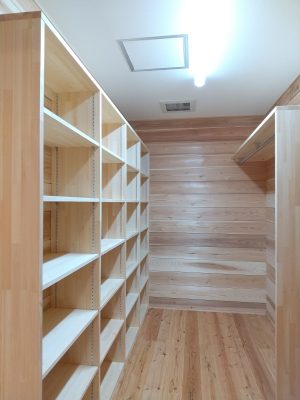 収納もたっぷり。お母様が、コレクションしてみえるマグカップを飾りたいとキッチンカウンター横にマグカップ用の棚を設置されています。2階には、階段の手すり壁の厚みを利用して単行本を入れられる本棚や、各部屋にある収納とは別に細長い4畳の納戸もあります。納戸には、断捨離する時になかなか捨てれない思い出の品(大切な人からもらった手紙やお子さんの作品)なども綺麗に整頓できそうな棚もあり、たまには見て当時を思い出す事もできそうです。