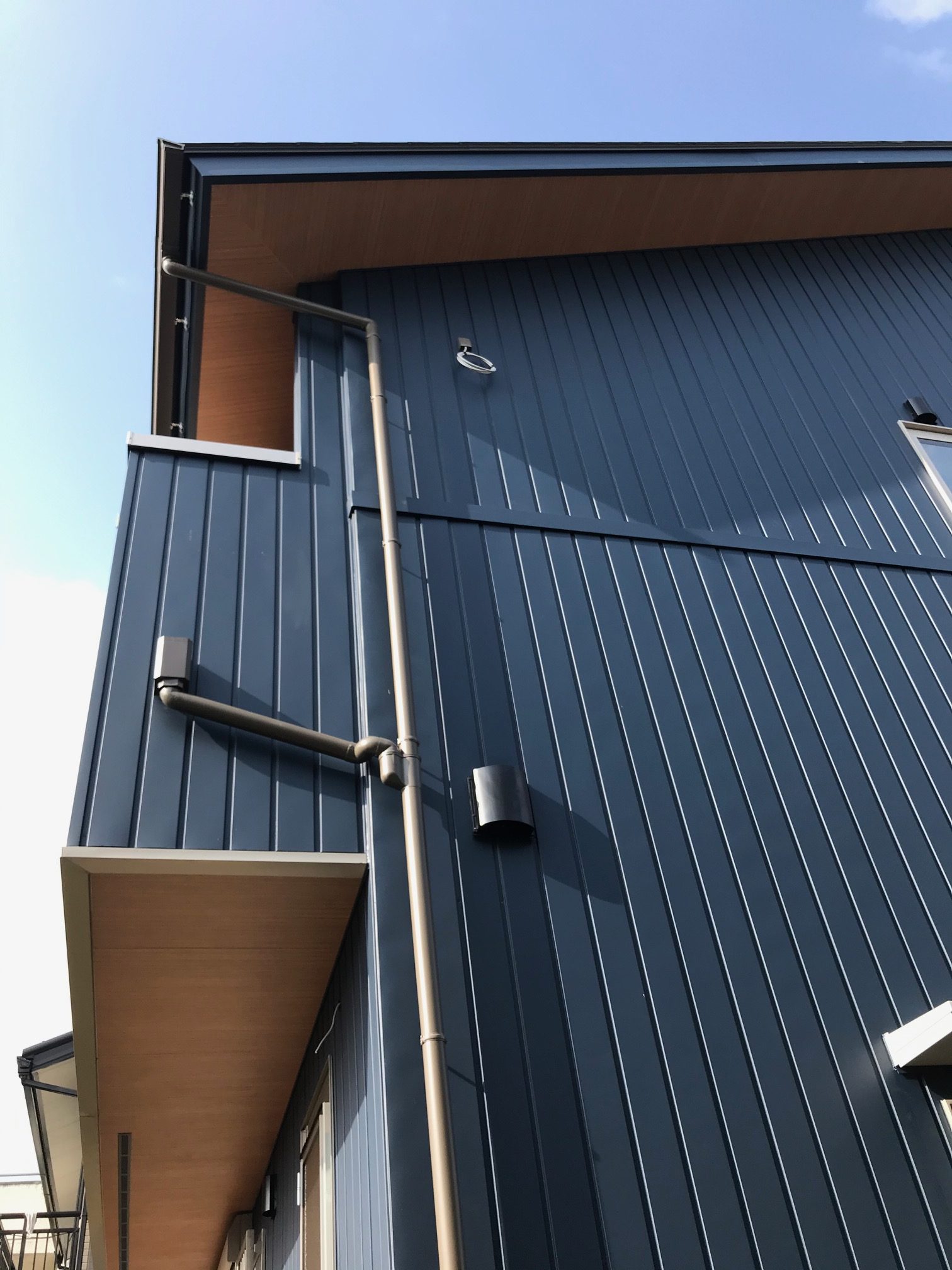 壁はガルバリウム鋼鈑とサイディングを使用し、破風・鼻隠し(屋根の端の細い部分)は壁に合わせて青色です。青色と木目の色合いがとても合っています。