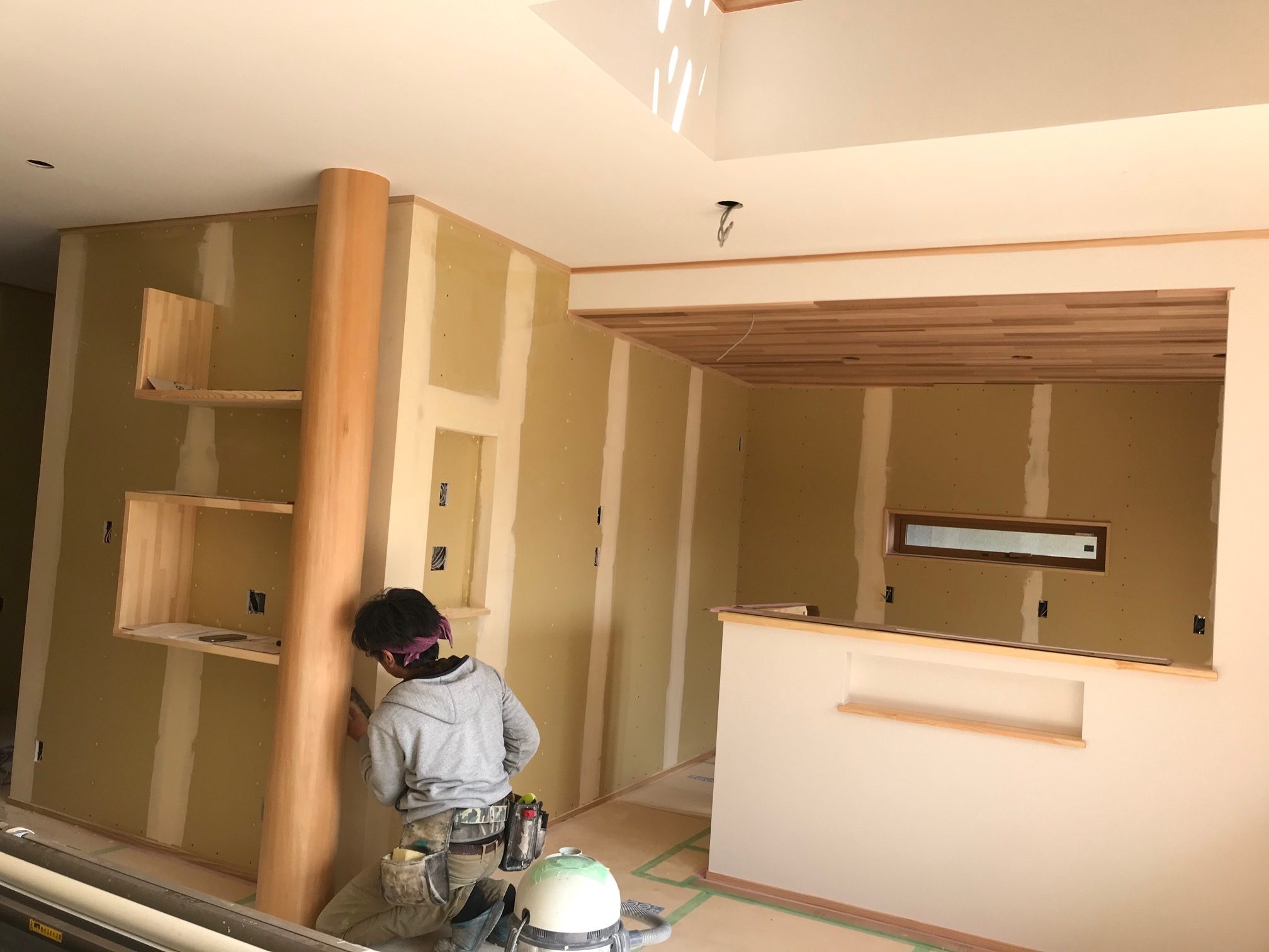 中に入るとクロス屋さんがパテ処理をしていました。