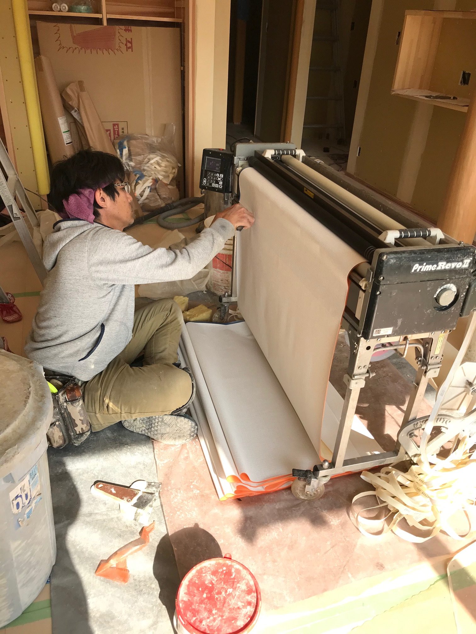 大きさによって違いますが、この現場でのクロス貼りは1人で作業して約10日ほどかかるそうです。