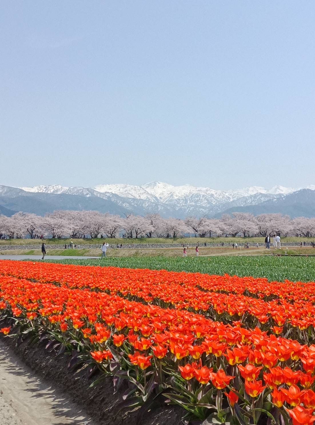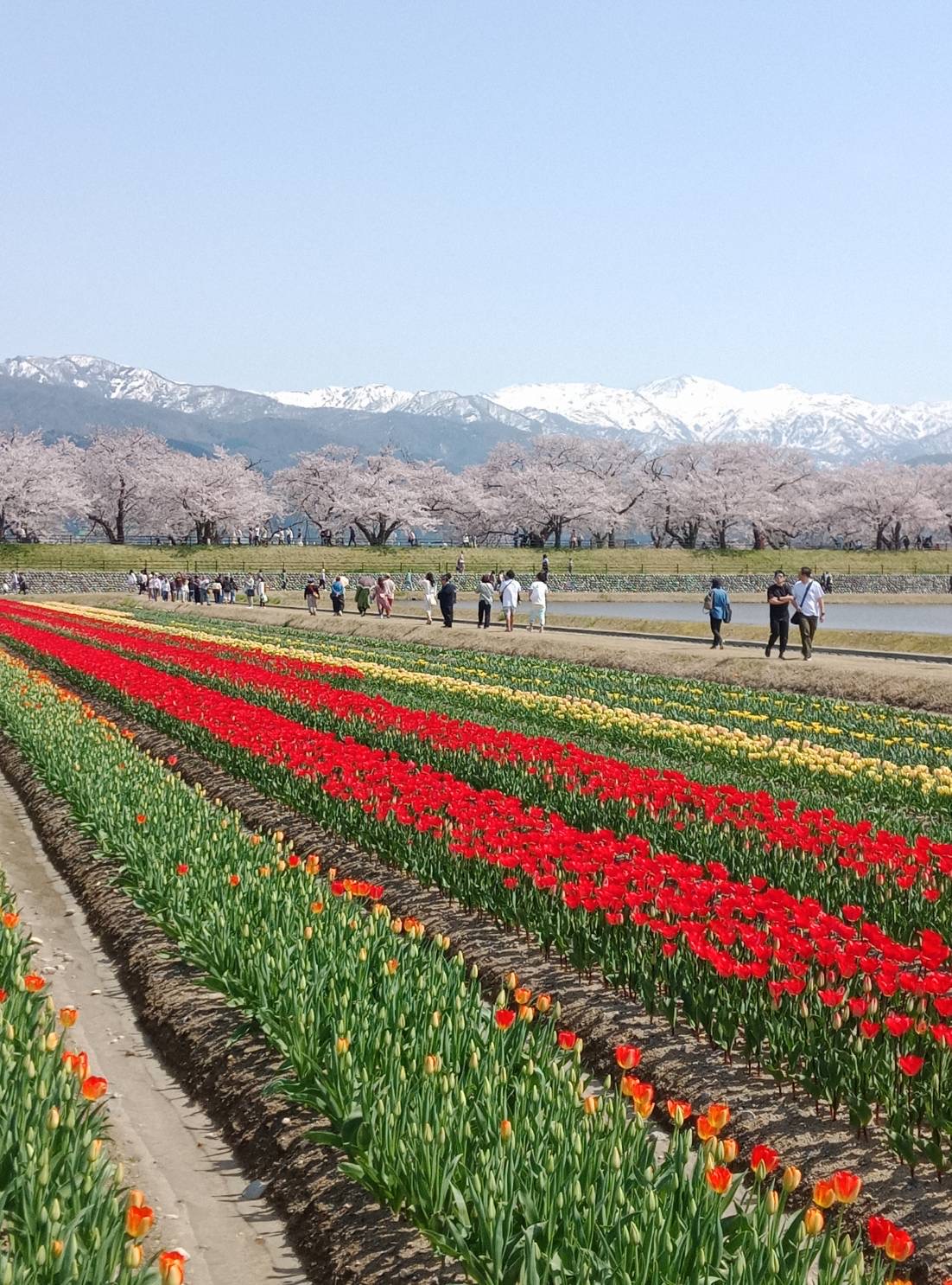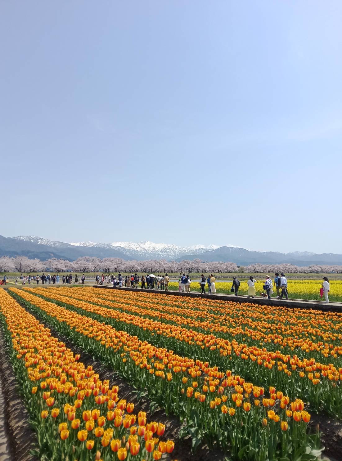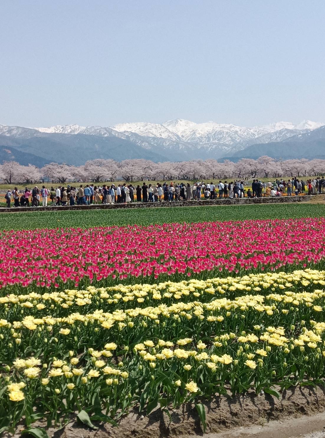 棟梁も初めは、応援にいっているのだから観光やお土産を買うのは・・・と思っていたそうですが、被災地でお金を使っていかなくてはと考えを改めて、作業の無い日曜日に観光をされたそうです。こちらは富山県朝日町の『春の四重奏』の様子です。残雪の朝日岳をバックに、チューリップ、菜の花、桜並木が色鮮やかで美しいです。