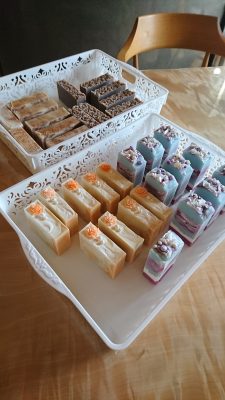 奥様のトールペイントや石鹸の作品も拝見し、会長がケーキのような美しい石鹸をちゃっかりおねだり。