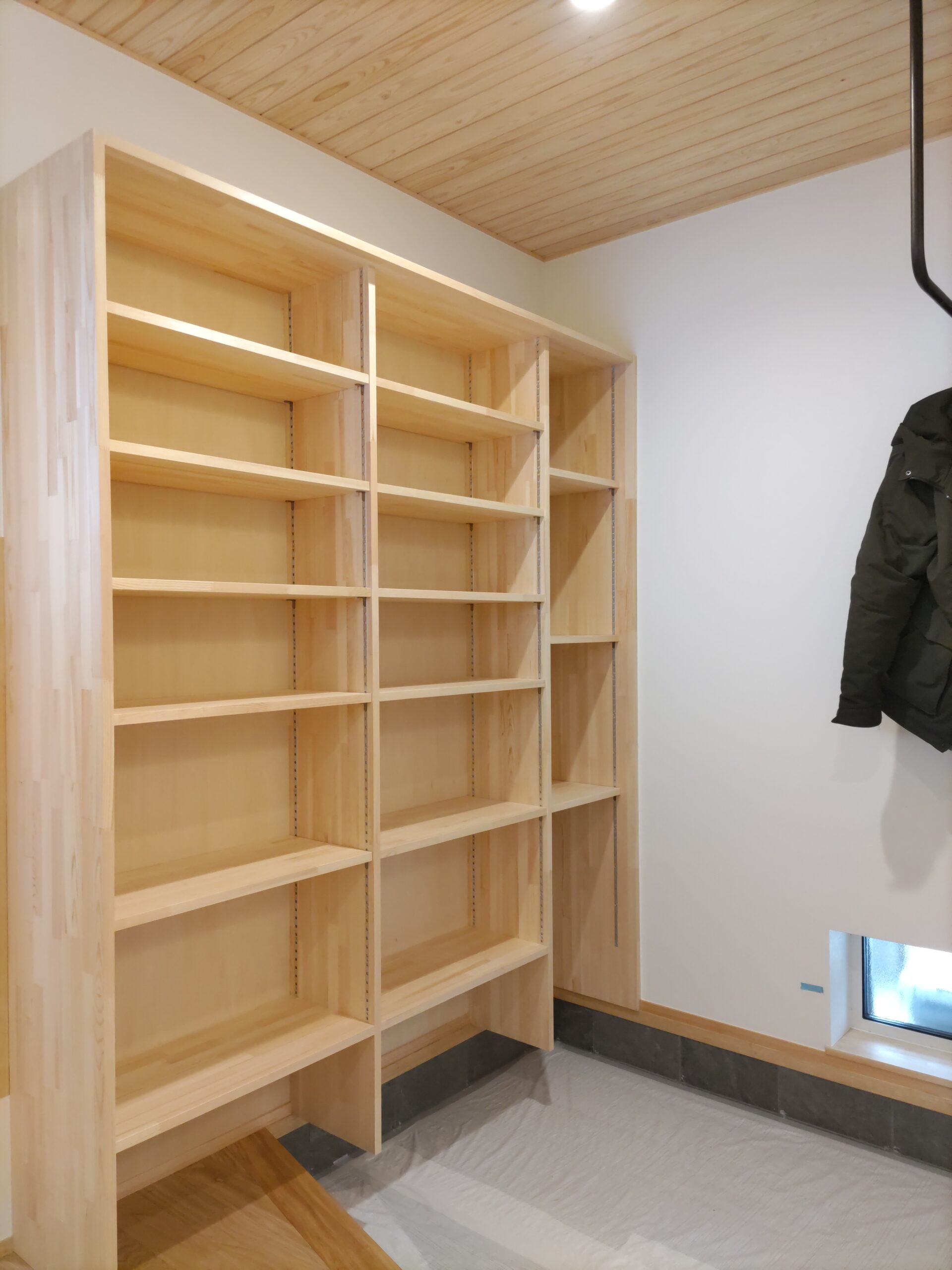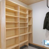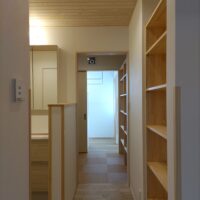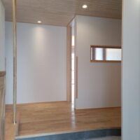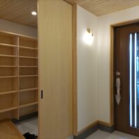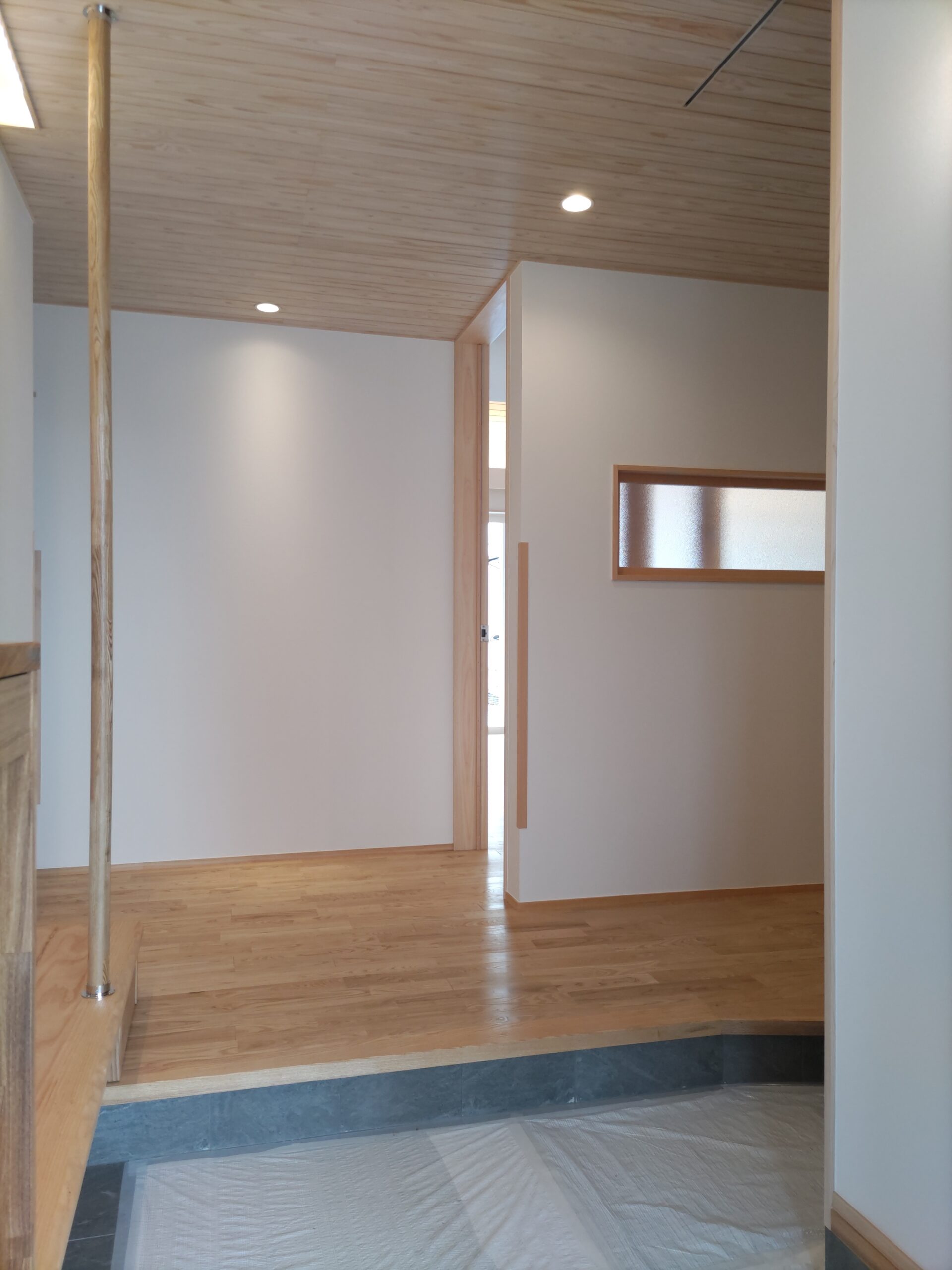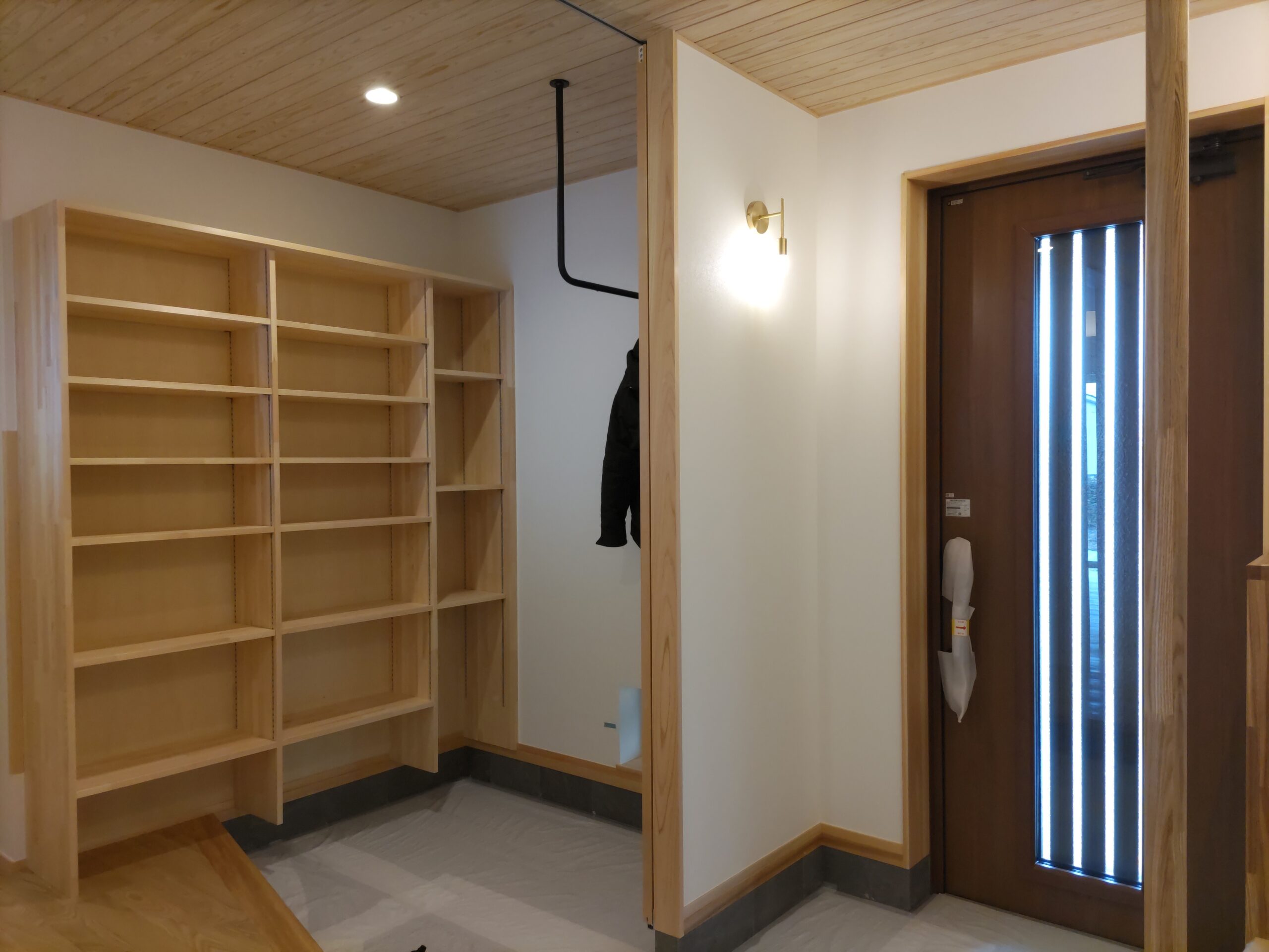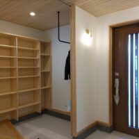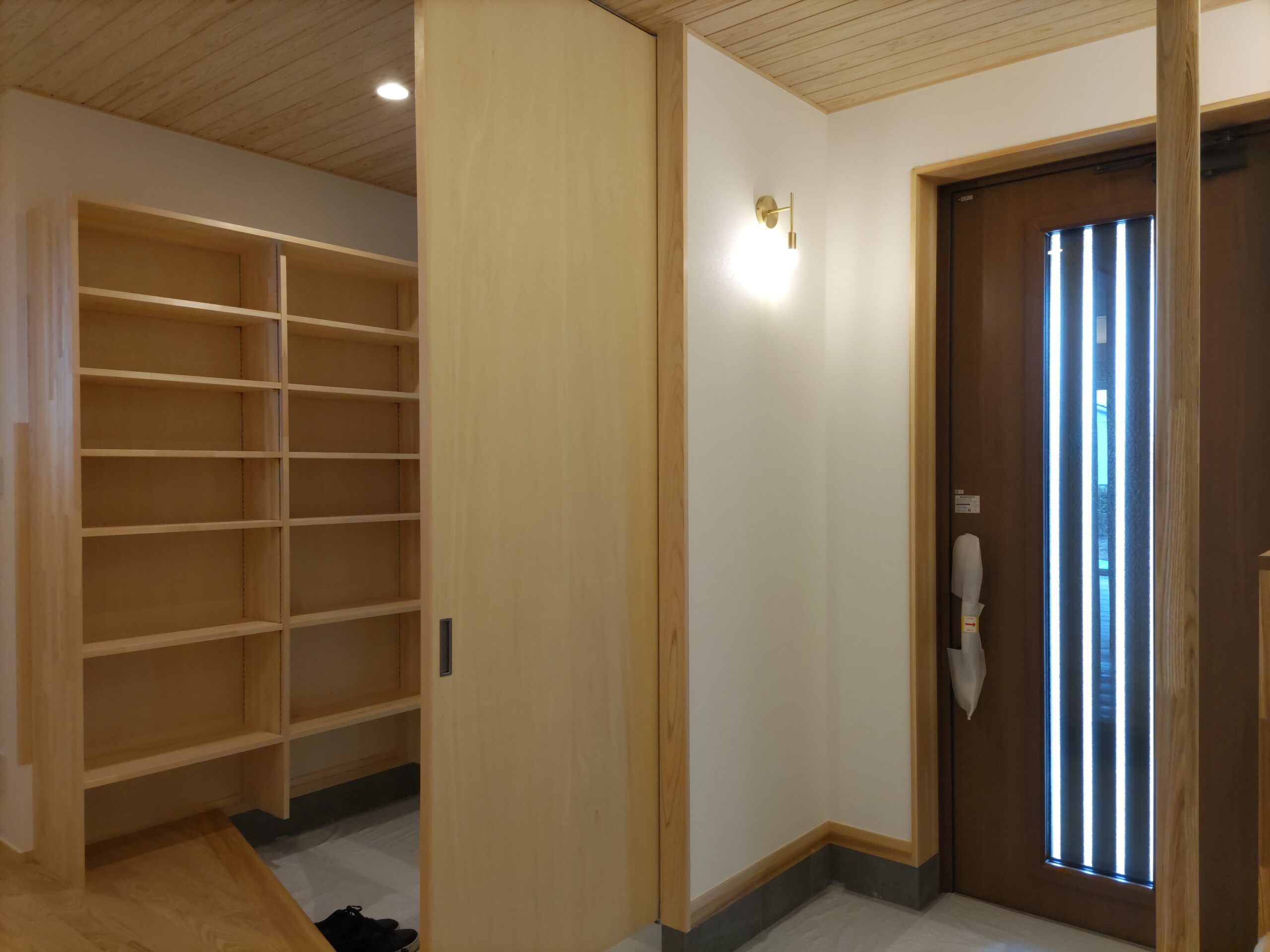 玄関扉を開けると、広々とした玄関。f様邸の特徴①です。写真ではこの玄関の良さが伝わらないのがもどかしい。玄関の横にSCLですが、通常は扉を開けて大きな玄関として使用。玄関先で話す時にSCL内を見えなくするための扉が付いています。上がり框の部分が大きいので、見学会の際にも靴を2列並べる事無く大勢が楽に使う事が出来ました👍