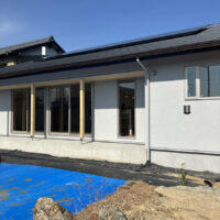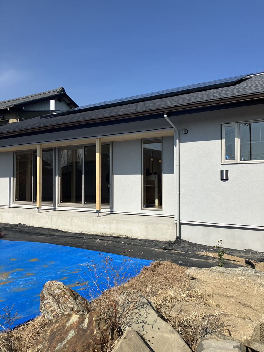 f様邸は、延べ床面積41.31坪、広めの平屋建て住宅です。敷地も広大な事から、日当たり抜群👍外壁はジョリパッド塗とほとんど見えない東西はガルバリウム鋼板張り。屋根はフラット瓦に太陽光を6kw搭載しています。壁には付加断熱55㎜を施し、UA値は0.28の高断熱住宅です。