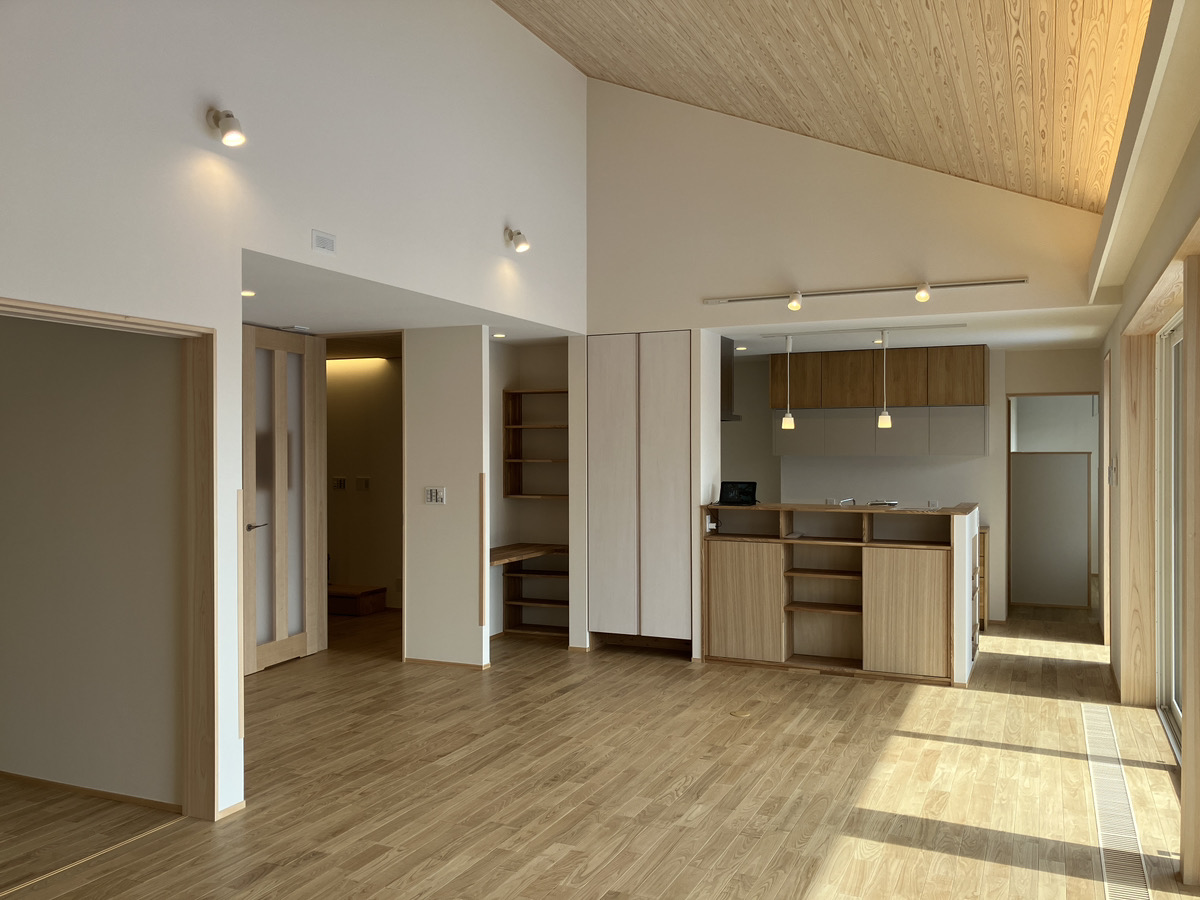 玄関すぐの扉を開けると、スタディコーナーを含めると、27.5帖広いLDK。勾配天井を照らす間接照明とカーテンボックスが一体になっており雰囲気が良いです。床材には、めずらしい栗の木を採用されました。オーク系ですが、いつものナラ材よりも色目が優しい感じです。