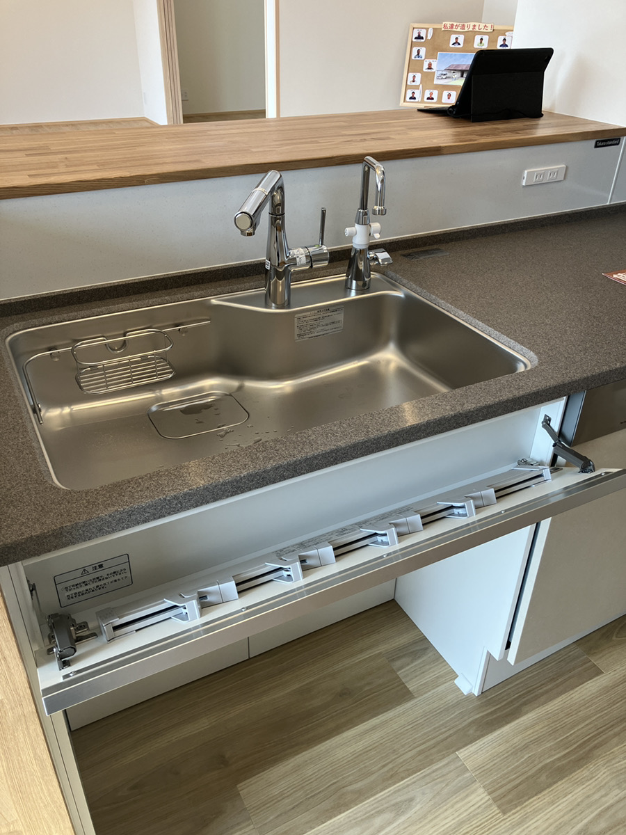 キッチンは、タカラのオフェリア。昨年から、シンクしたをOPENにしてゴミ箱が入れれるようになりました。タカラさんは、お客様のニーズを素早くキャッチして、商品に反映されるので、凄いといつも感心します。包丁差しもちゃんとありますし、配管の点検口も両開きになっていて、浄水器も取り替えやすい設計。関西の方特有の『おせっかい』が、こういうきめ細かな配慮に通じるのだろうなぁ。我々、尾張名古屋っ子も見習わねば💦