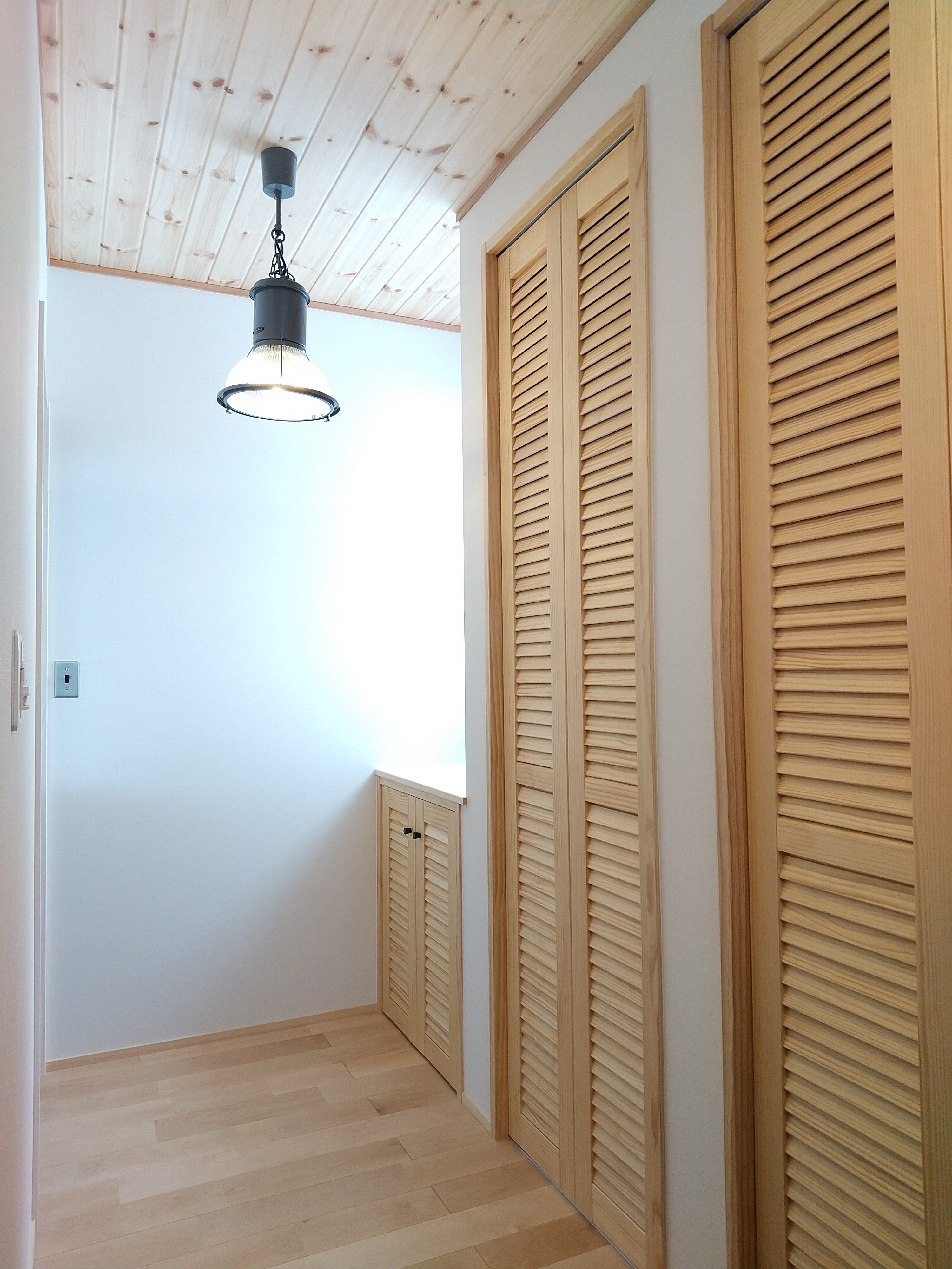 延べ床面積は約35坪で、コンパクトな総2階の住宅です。玄関もコンパクトではありますが、収納たっぷり。土間の部分と床の部分に分けて、クローゼットを設けています。アウトドア好きのyk様。いろんなキャンプ用品を詰め込まれるのでしょうね~