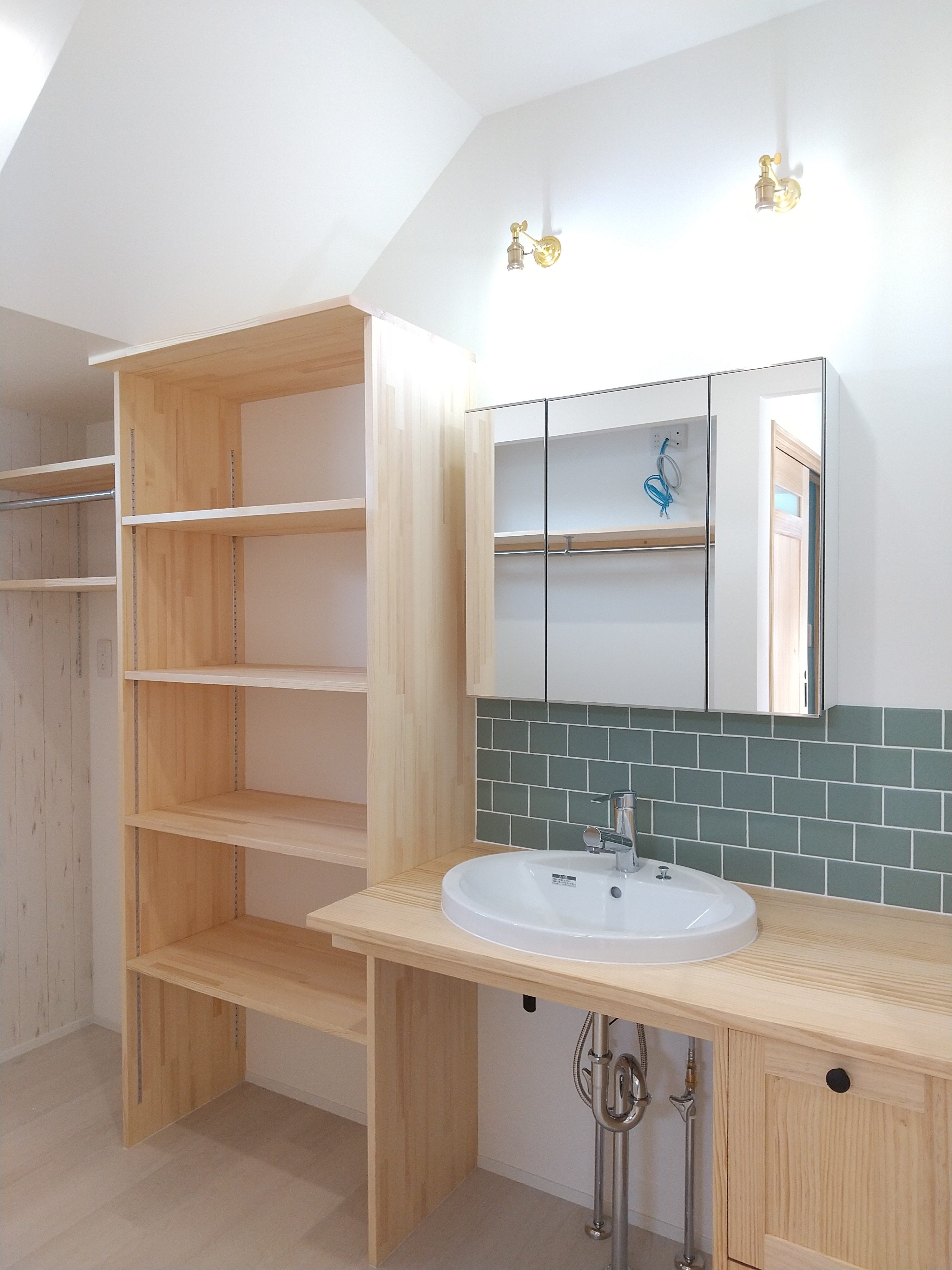 キッチンの横手には、洗面、トイレ、浴室と水廻りが集約されて、家事動線もバッチリです。ポイントにタイルを貼られて、かわいい雰囲気が出ています。
