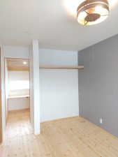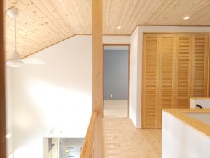 LDKの吹き抜けに面して、2階の廊下があり、東西に分かれて寝室とお子さんの部屋があります。LDKから「お~い朝だよ~」なんて声をかけるのも楽ちんです。声をかけられる前に、朝食のいい香りで起きられるかも。